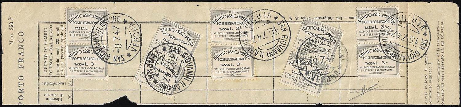 1947 - 3 lire Previdenza Postelegrafonici, I parte (15), cinque coppie, perfette, usate su ampio frammento a San Giovanni Ilarione con ... Leggi tutto