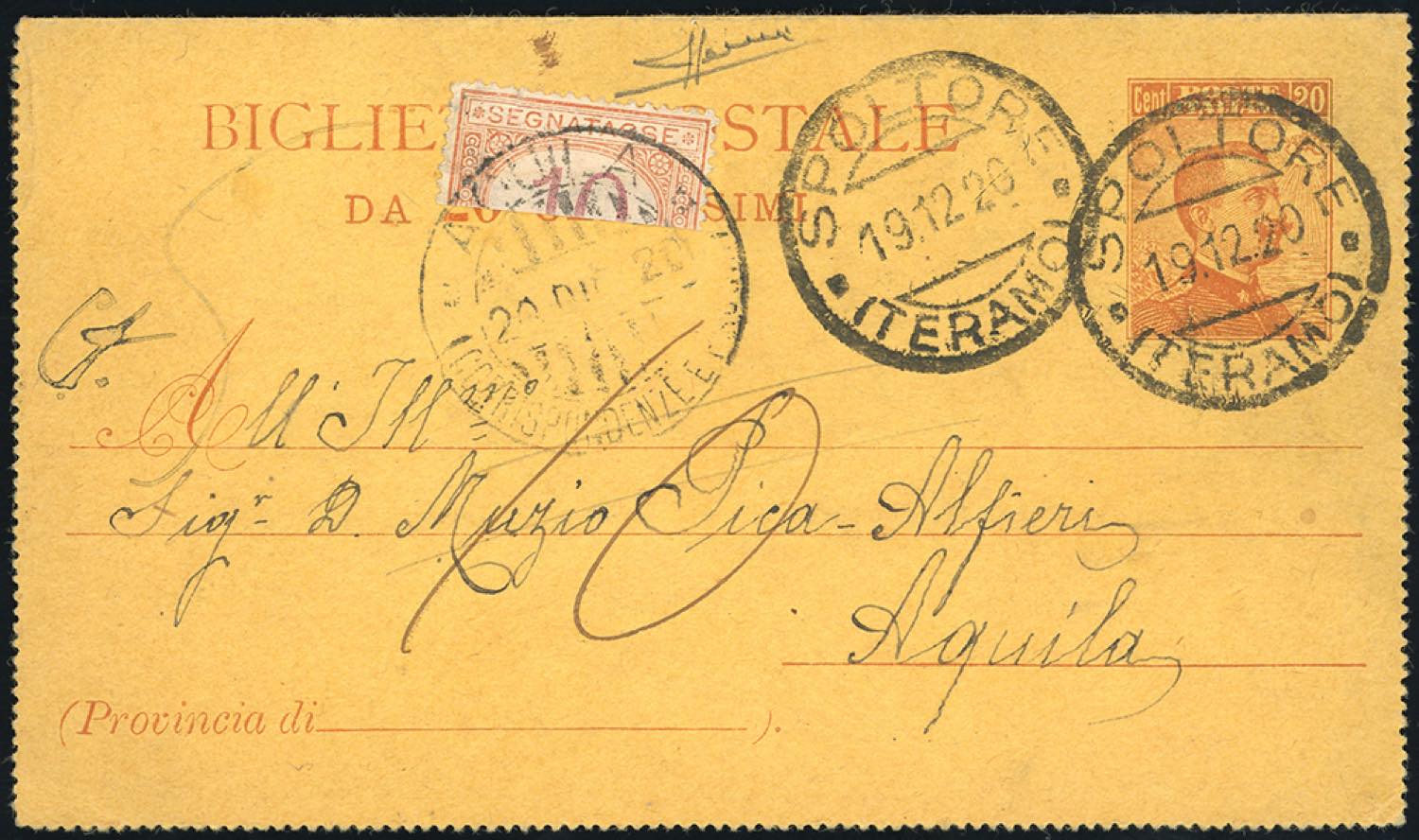 1920 - 10 cent. arancio e carminio (21), frazionato orizzontalmente a metà, usato come tassa semplice a carico del destinatario su 20 cent. biglietto postale (Filagrano B14), da Spoltore 19/12/1920 a L'Aquila. Molto raro. Cert. Sorani.