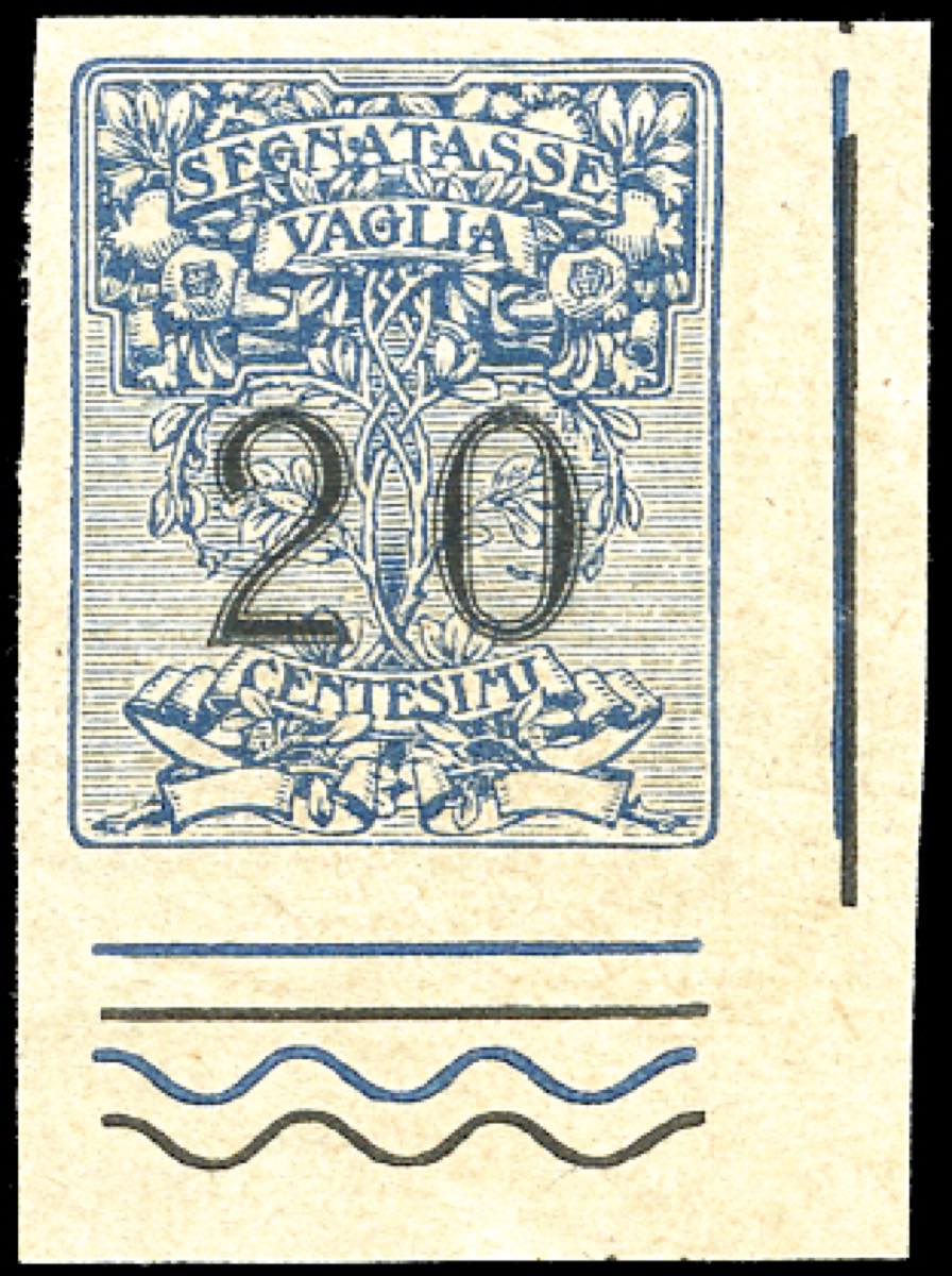 1924 - 20 cent. prova d'archivio su carta grigia non filigranata, non dentellata (P1), angolo di foglio, perfetta. Molto bella.