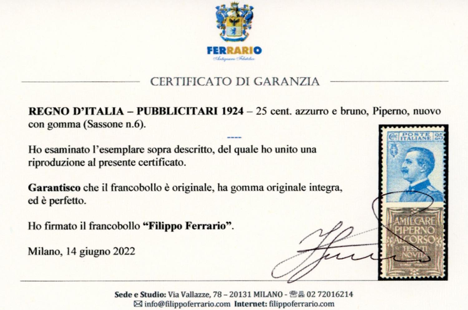 Lotto 1290 - 1924 - 25 cent. Piperno (6), gomma originale integra, ...