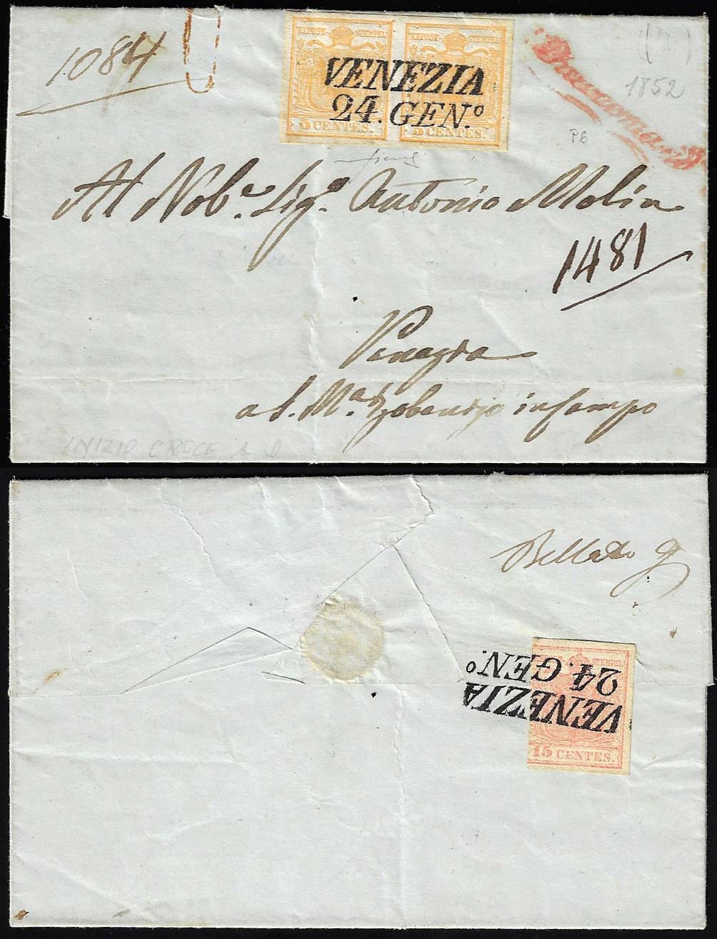 1852 - 5 cent. giallo ocra, coppia, perfetta e, al verso, 15 cent. rosa, III tipo, intaccato a sinistra (1,5), su raccomandata da Venezia 24/1/1852 per città. Rara combinazione! Cert. Fiecchi.