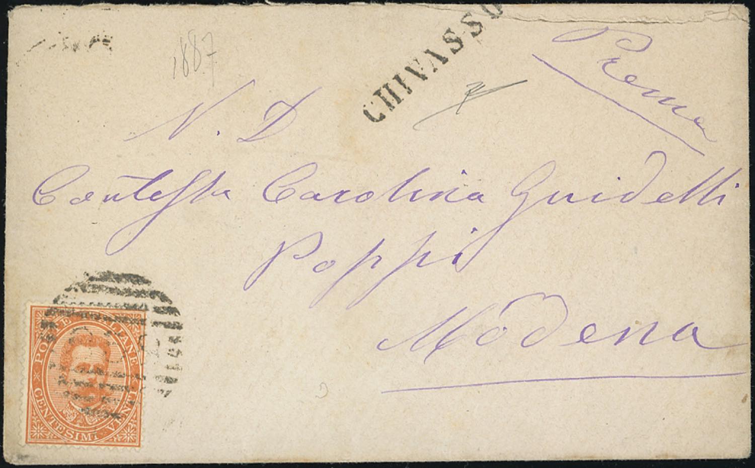 CHIVASSO, lineare - 20 cent. (39), perfetto, su busta per Modena 29/7/1887. R.Diena.
