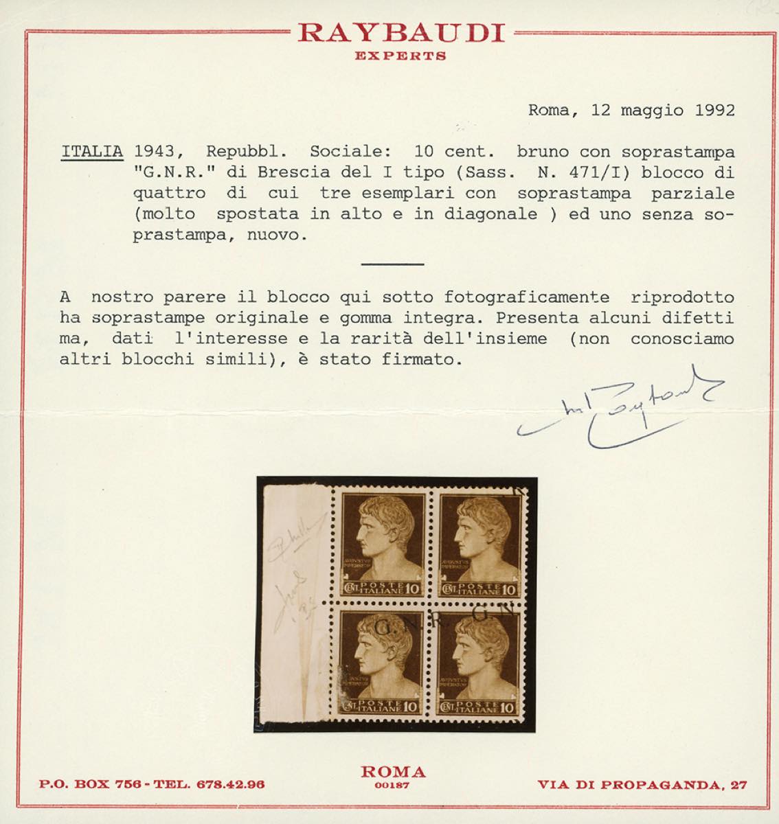 1943 - 10 cent. soprastampa G.N.R. di Brescia, I tipo, blocco di quattro, un esemplare senza soprastampa, tre con soprastampa obliqua, fortemente spostata e parziale per due esemplari (471/Ib), bordo di foglio, gomma originale, lievi difetti. INSIEME UNICO! Mondolfo, Fiecchi, cert. Raybaudi.