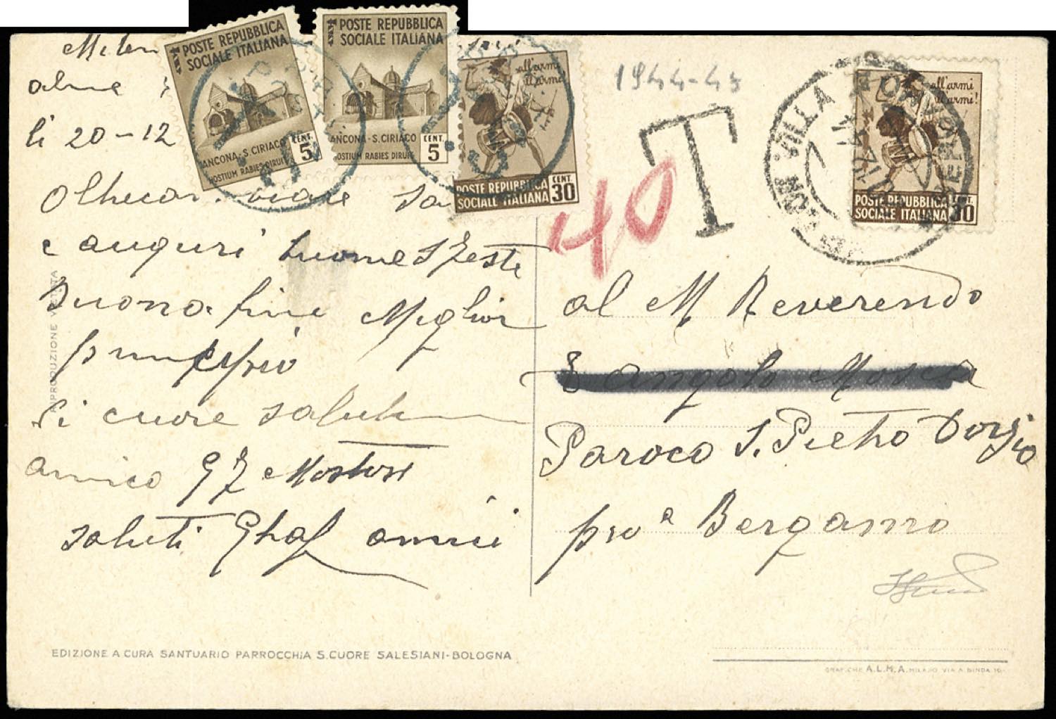 1944 - 30 cent. Monumenti distrutti (506), su cartolina insufficientemente affrancata dalla provincia di Bergamo 20/12/1944 per città, tassata in arrivo con: 5 cent., due esemplari, e 30 cent. Monumenti distrutti (502,506). Molto raro l'uso del basso valore da 5 cent. come segnatasse d'emergenza. Ferrario.
