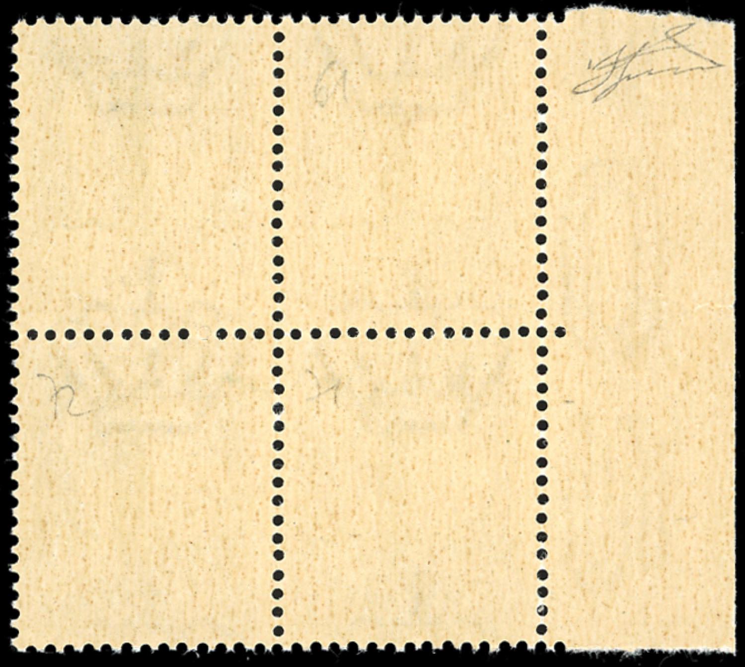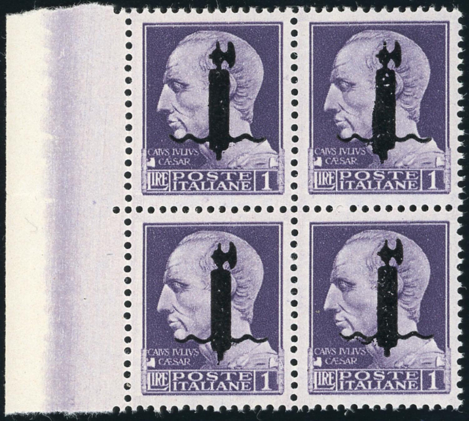 1944 - 1 lira violetto Imperiale, soprastampa fascio in nero (P12A), blocco di quattro, gomma originale integra, perfetto. Bellissimo e raro. Cert. Ferrario.