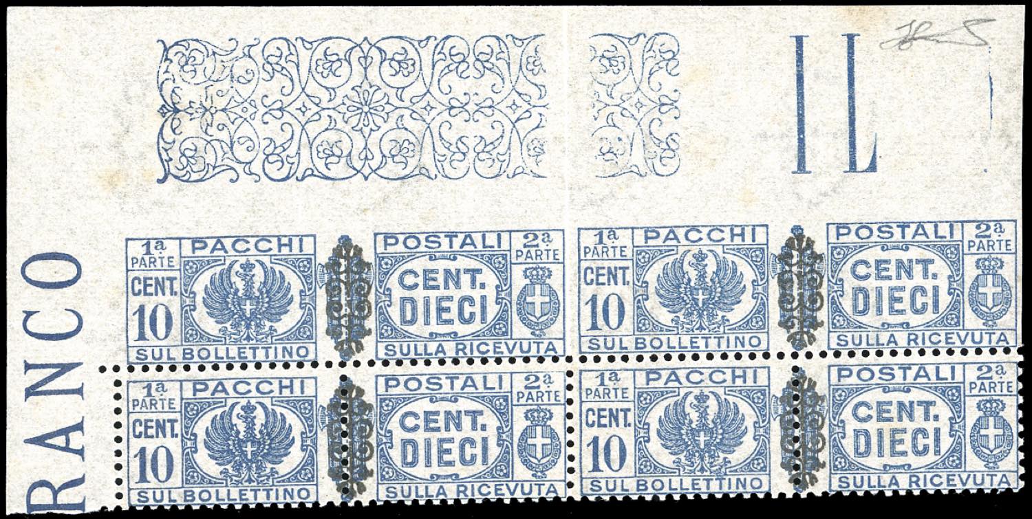 1945 - 10 cent. soprastampato, blocco di quattro con i due esemplari superiori dentellati solo in basso (49fa), angolo di foglio, gomma originale integra, perfetto. Ferrario.