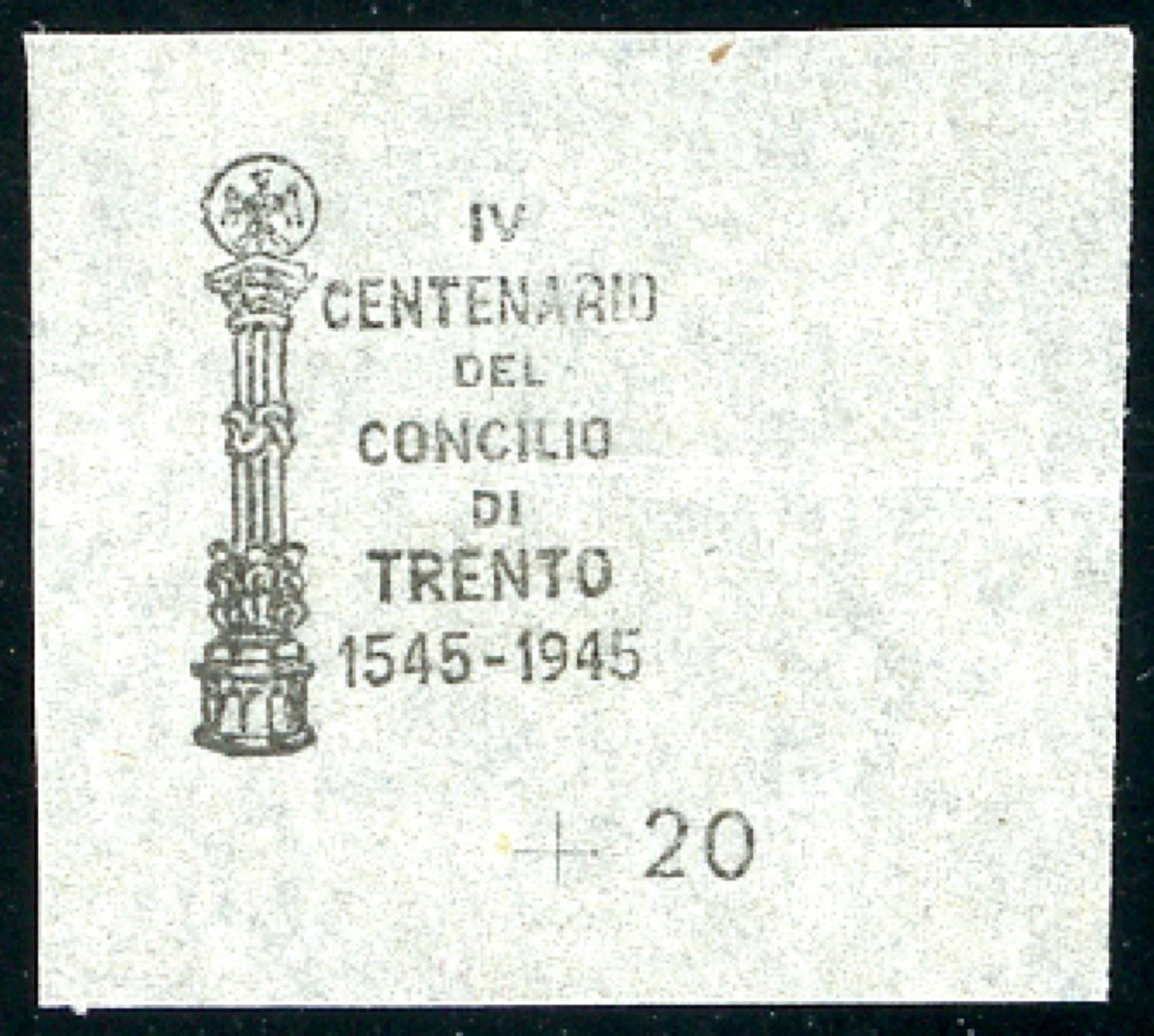 1945 - IV centenario del Concilio di Trento, prova di soprastampa tipografica del valore da 20 cent. in nero su carta sottile, pos. 80, ... Leggi tutto