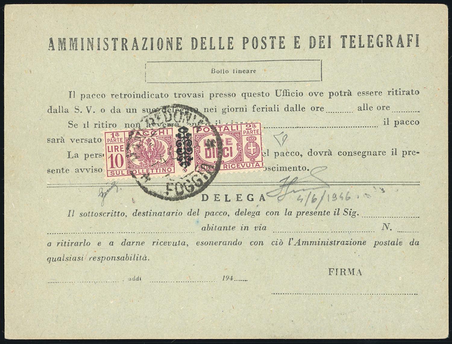 PACCHI POSTALI 1946 - 10 lire lilla rosa, soprastampato (58), perfetto, su modulo di ricevimento pacchi, annullato Manfredonia 4/6/1946, ... Leggi tutto
