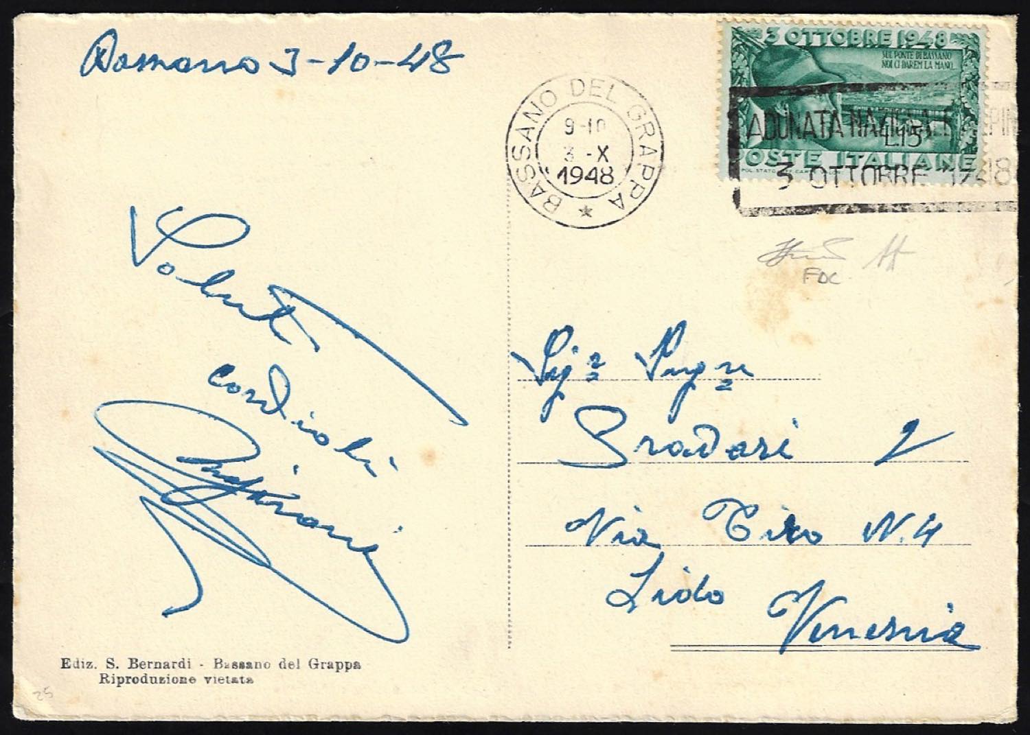 1948 - 15 lire Bassano (592), perfetto, su cartolina da Bassano del Grappa 3/10/1948, annullo a targhetta speciale, a Venezia. Interessante lettera del primo giorno di emissione. A.Diena, Ferrario.