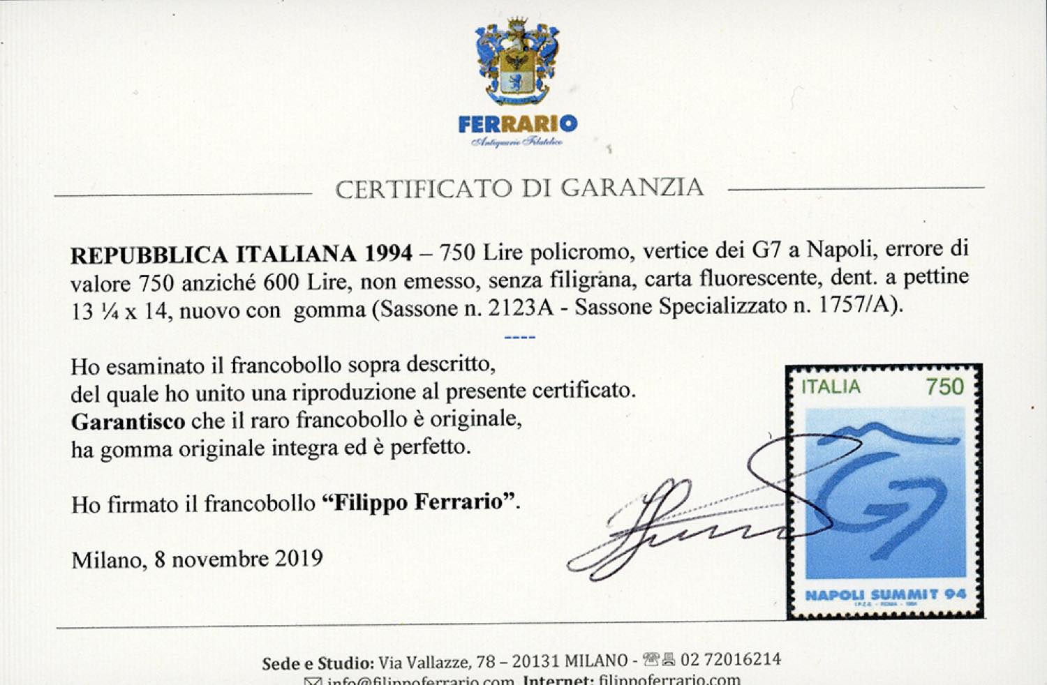 1994 - 750 lire G7, non emesso, errore di valore (2123A), gomma integra, perfetto. Rarità del settore. Cert. Carraro e Ferrario.