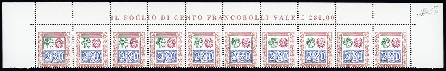 2004 - 2,80 € Alti valori (2739), dentellatura orizzontale fortemente spostata in alto, striscia orizzontale di dieci, angolo di foglio, gomma originale integra, perfetta. Ferrario.