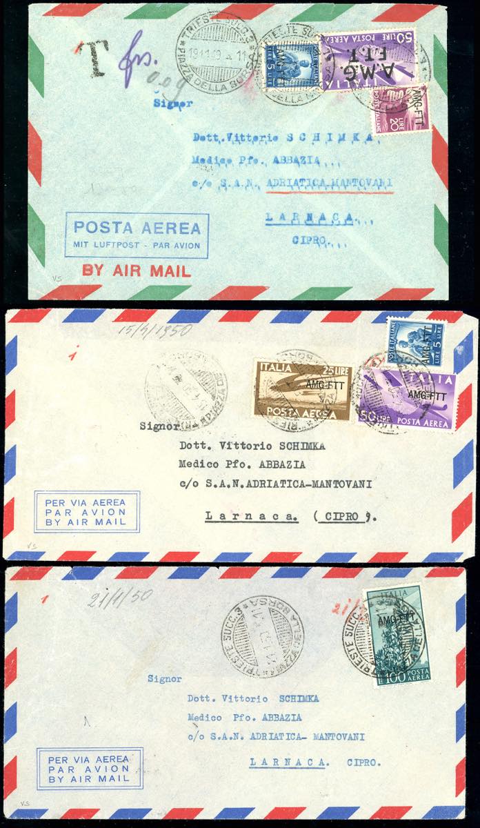 POSTA AEREA 1949/50 - Tre aerogrammi con differenti affrancature comprendenti francobolli di posta aerea, tutti indirizzati a Cipro. Interessanti e non comuni.