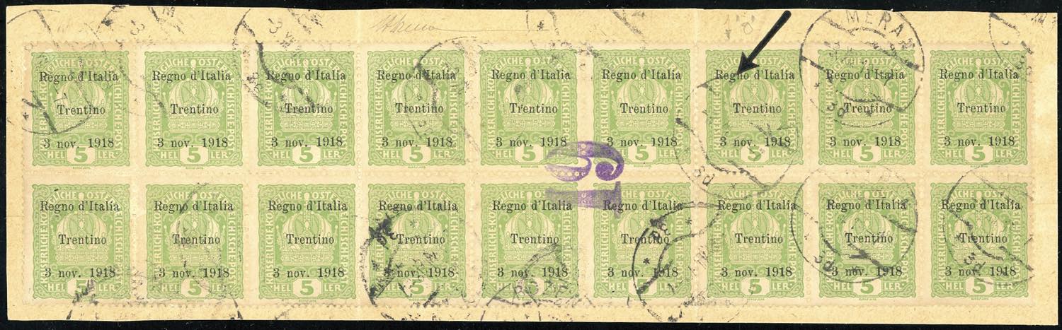 TRENTINO ALTO ADIGE 1918 - 5 h. soprastampato (2), blocco di 18 esemplari, perfetto, usato su frammento. Si tratta del massimo blocco usato di questo francobollo. A.Diena.