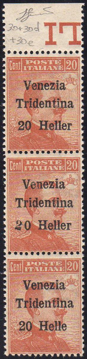 TRENTINO ALTO ADIGE 1918 - 20 heller su 20 cent., striscia verticale di tre, il secondo con cifra "2" stampigliata a mano, il terzo con varietà "Helle" (30+30d+30e), gomma originale integra, perfetta. Non comune! Ferrario.