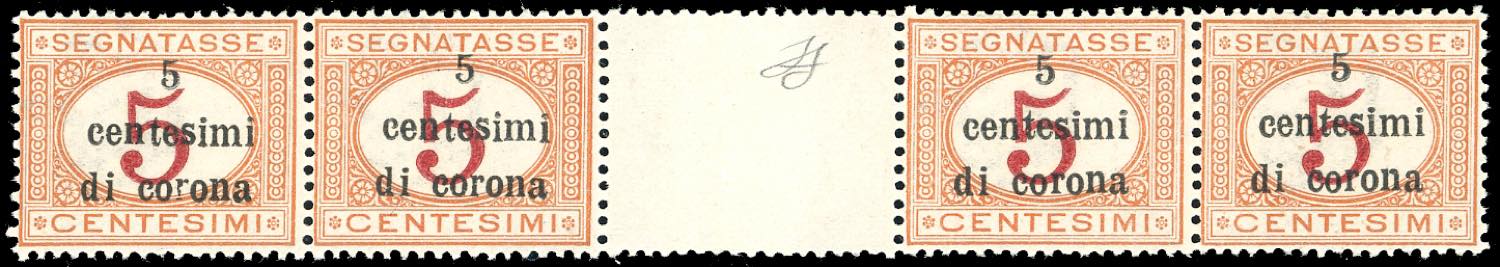 TRENTO E TRIESTE SEGNATASSE 1919 - 5 cent. su 5 cent. (1), striscia orizzontale di 4 con interspazio di gruppo al centro, gomma originale ... Leggi tutto
