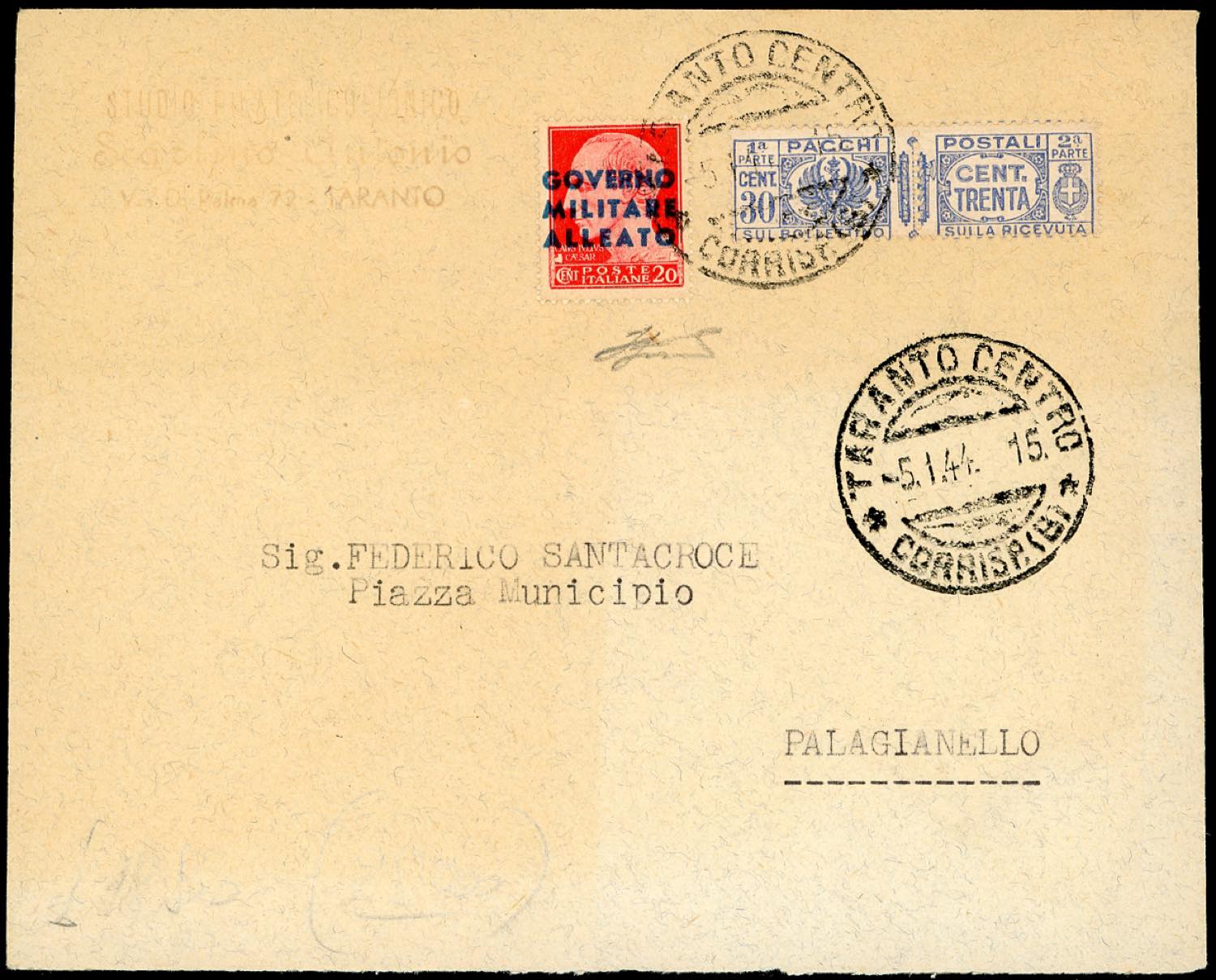 OCCUPAZIONE ANGLO-AMERICANA NAPOLI 1944 - 20 cent. soprastampato (10), in affrancatura mista con 30 cent. pacchi postali con fascio al centro (27), perfetti, su busta da Taranto 5/1/1944 a Palagianello, bollo d'arrivo. Ferrario.