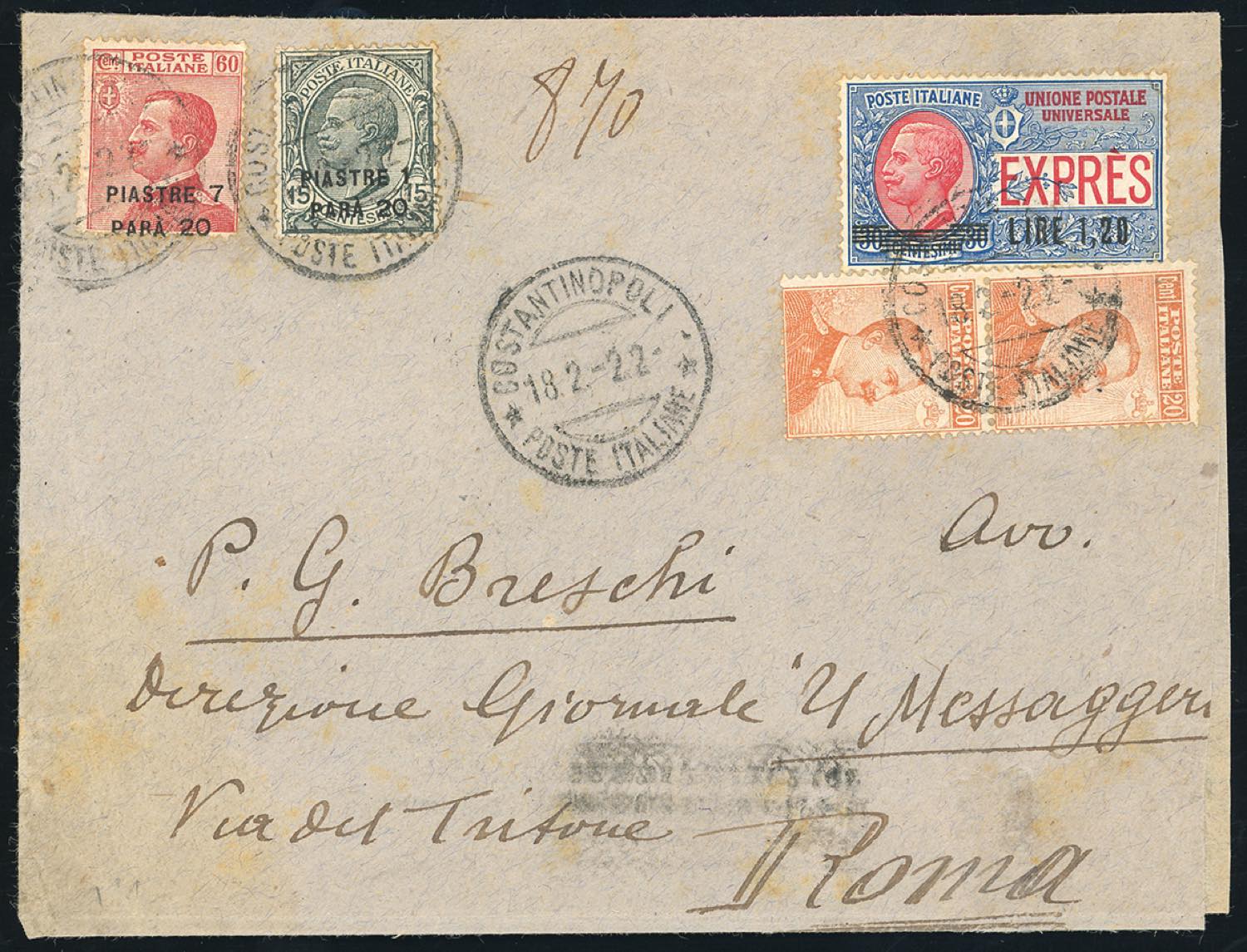 COSTANTINOPOLI 1922 - 1,20 pi. su 15 cent., 7,20 pi. su 60 cent. (36/39), perfetti in affrancatura mista con 20 cent. Michetti, coppia, e 1,20lire espresso soprastampato (Regno 109,E5), su busta da Costantinopoli 18/2/1922 a Roma. Interessante!
