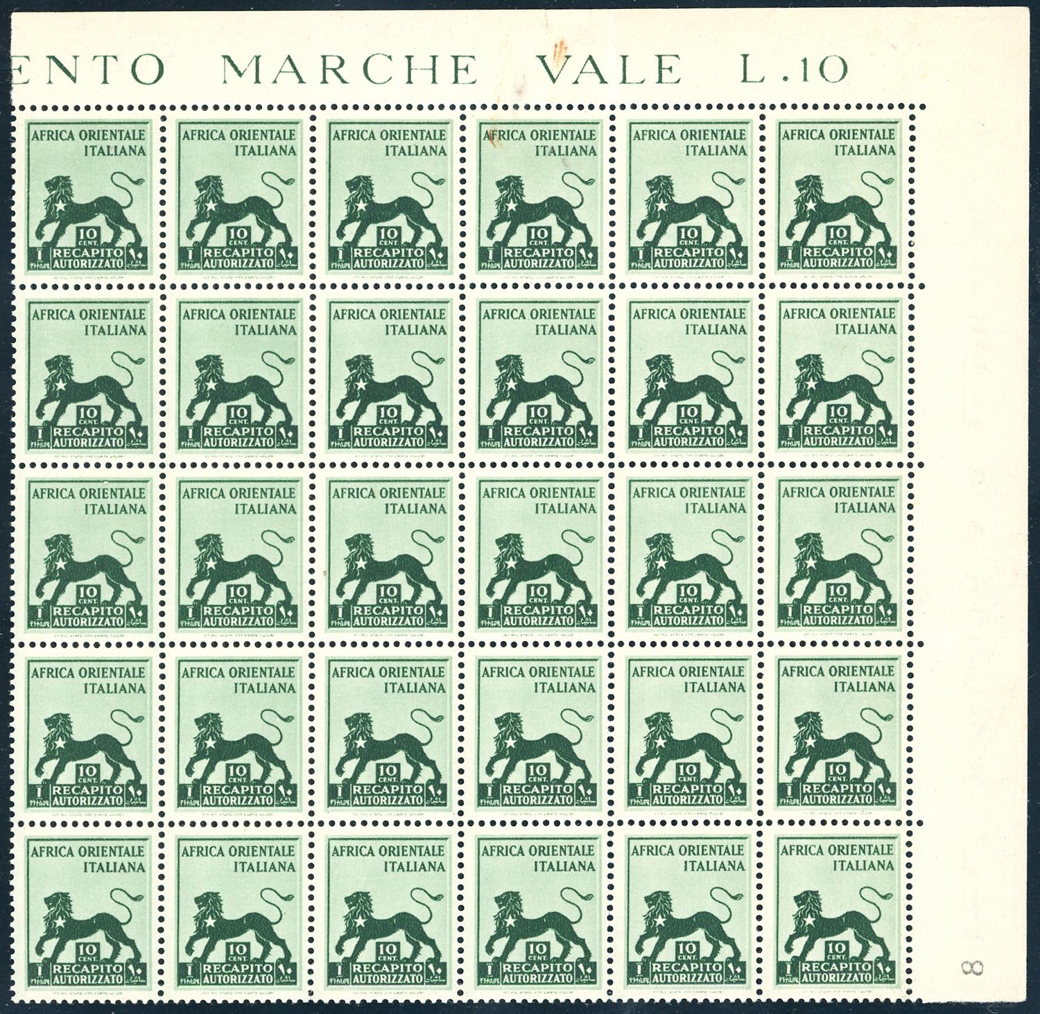 RECAPITO AUTORIZZATO 1942 - 10 cent. Leone (1), blocco di 30 esemplari, angolo di foglio, gomma originale integra, perfetto.