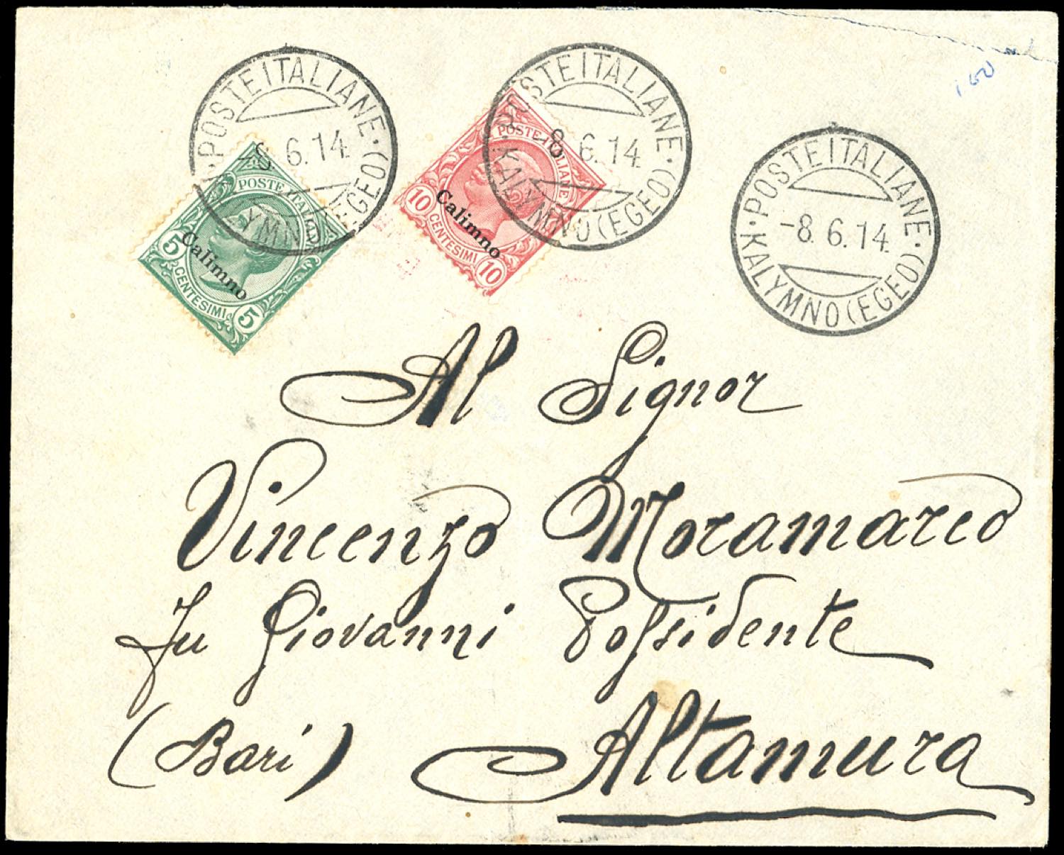 CALINO 1914 - 5 cent. e 10 cent. Leoni soprastampati (2/3), perfetti, su busta da Calino 8/6/1914 ad Altamura.