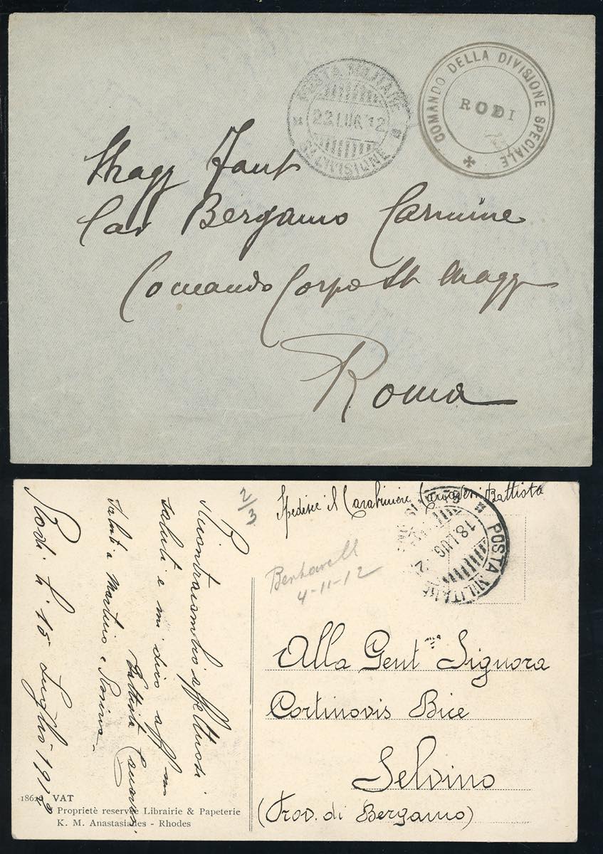 RODI 1912 - Una lettera e una cartolina non affrancate, entrambe in partenza da Rodi con i bolli della Posta Militare, rispettivamente del 23/7/1912 per Roma e del 18/7/1912 per Selvino.