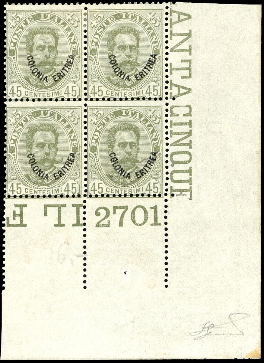 1896 - 45 cent. verde oliva Umberto I, soprastampa fortemente spostata in alto e a destra, blocco di quattro, angolo di foglio integrale inferiore destro, con numero di tavola 2701 (18c), nuovo, gomma originale integra, linguellata la coppia superiore. Splendido ed estremamente raro, insieme unico. Cert. Ferrario.