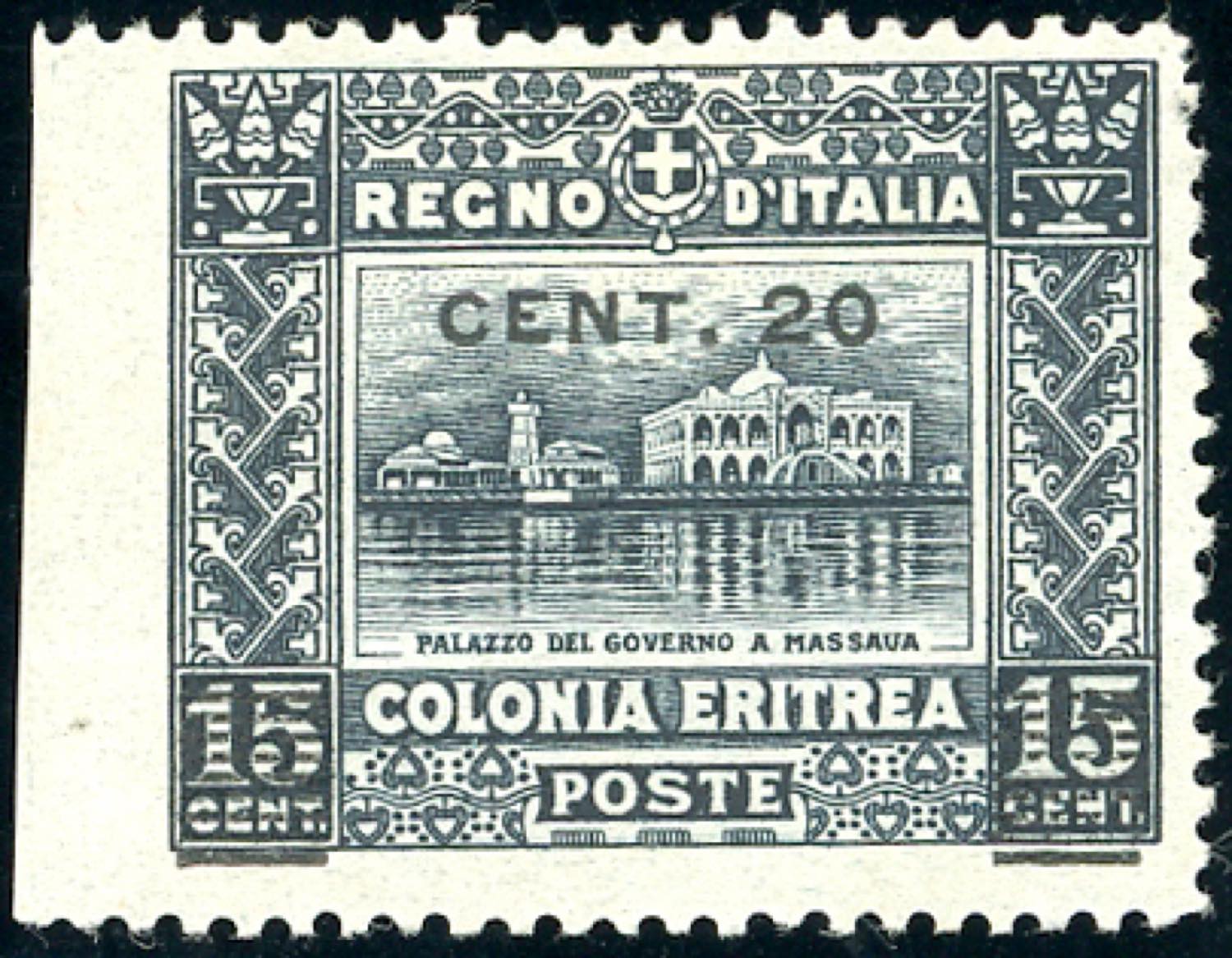 1916 - 20 cent. su 15 cent., non dentellato a sinistra (46g), bordo di foglio parziale, gomma originale, perfetto. A.Diena.