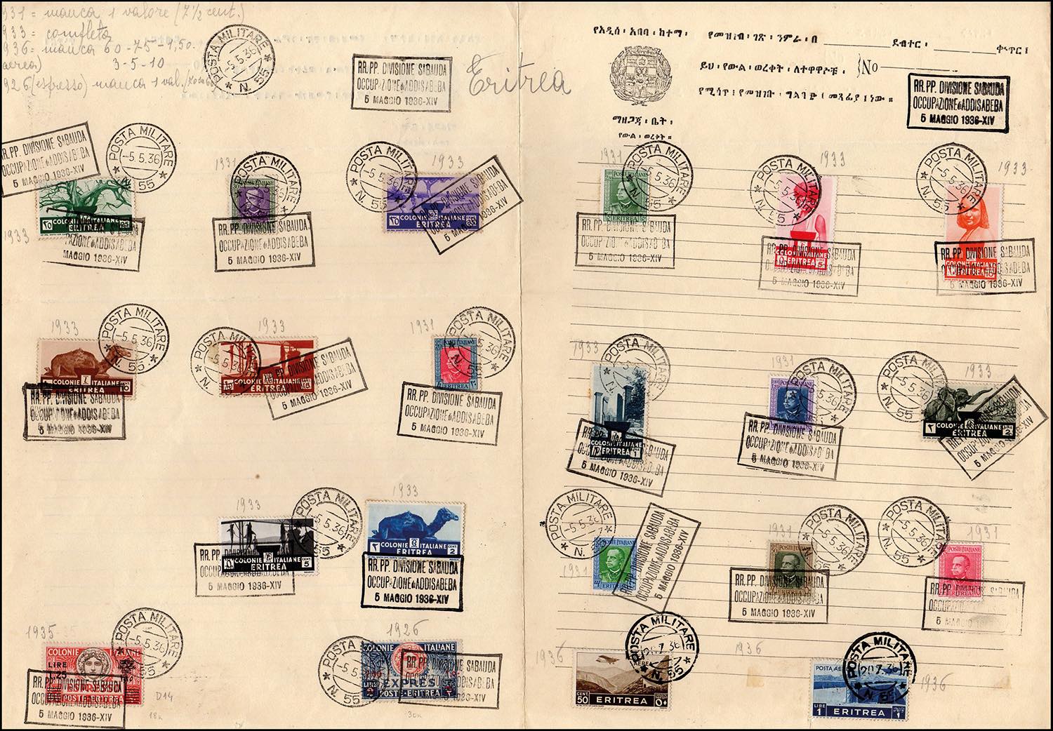 1936 - Ventuno esemplari del periodo (196/202,203/212,A17/18,A21,A23,E7,E9), usati su un foglio con annulli P.M. n. 55 5/5/36 e bollo riquadrato della Occupazione di Addis Abeba.