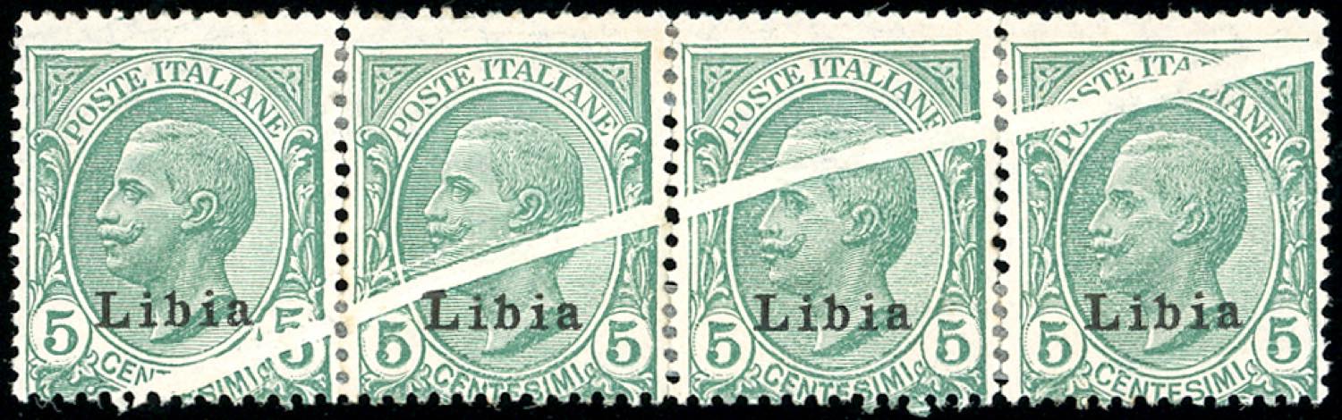 1912 - 5 cent. Leoni soprastampato (3), striscia orizzontale di quattro attraversata da un'evidente plì d'accordeon obliqua, nuova senza gomma, gli esemplari sono stati ricollocati nelle posizioni originarie tramite linguelle, perfetta. D'effetto e non catalogata.