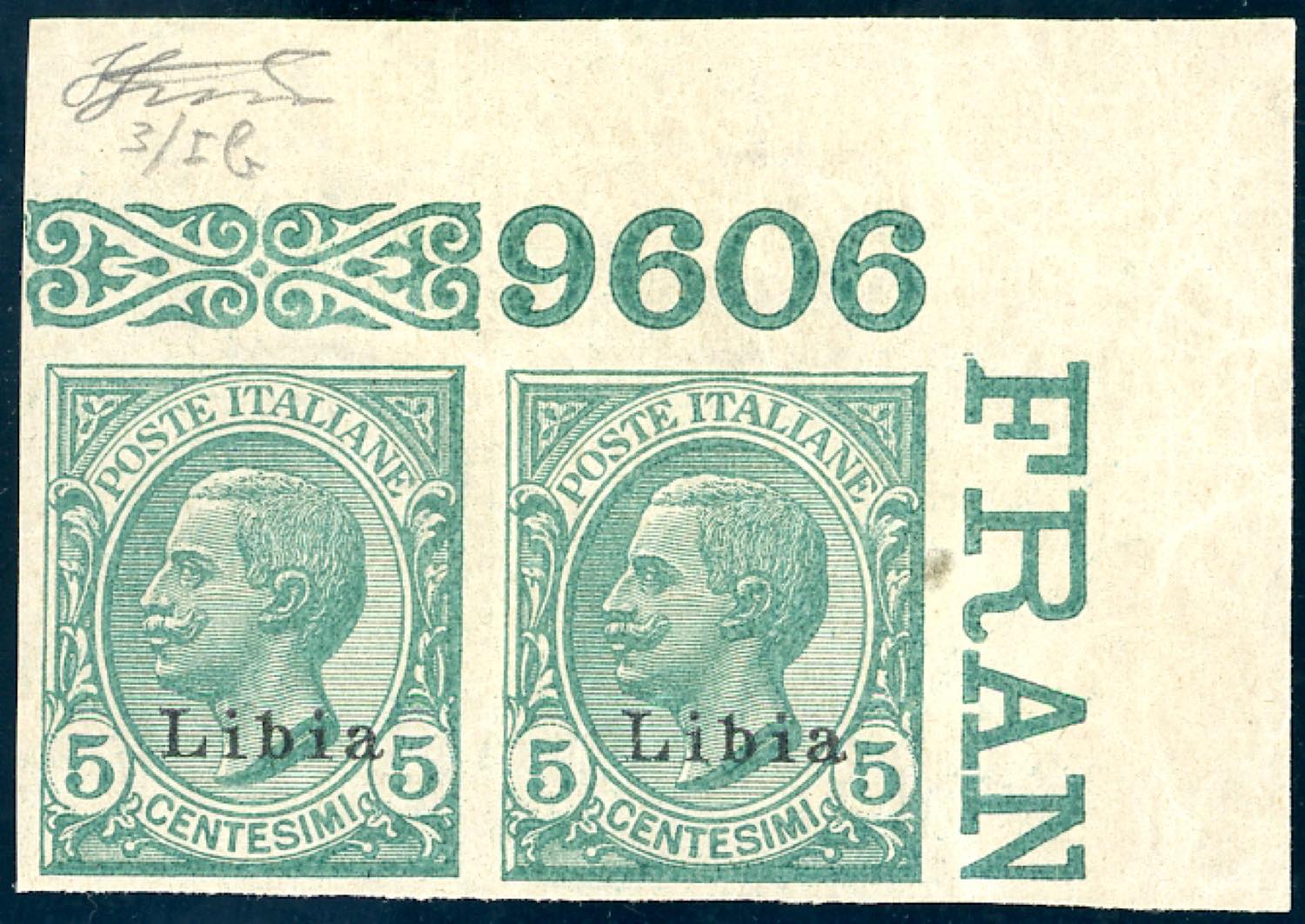 1912 - 5 cent. verde Leoni, non dentellato, soprastampa del II tipo (3/Ib), coppia orizzontale, angolo di foglio superiore destro con numero di tavola 9606, nuova, gomma originale integra, perfetta. Insieme molto raro, probabilmente unico. Ferrario.