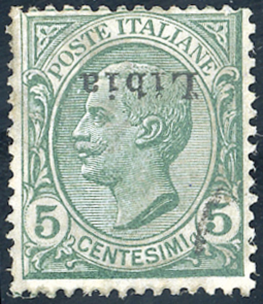 1912 - 5 cent. Leoni, soprastampa capovolta (3c), perfetto, usato. Rarissimo, TRE SOLI ESEMPLARI NOTI. Cert. G.Bolaffi, A.Diena, Ferrario. Leggi tutto