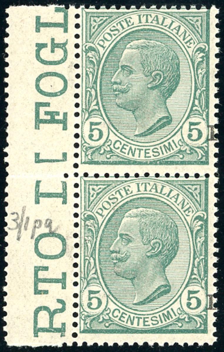 1912 - 5 cent. Leoni, soprastampa del II tipo, solo "L" in soprastampa (3/Ipa), coppia verticale, bordo di foglio, gomma integra, perfetta.