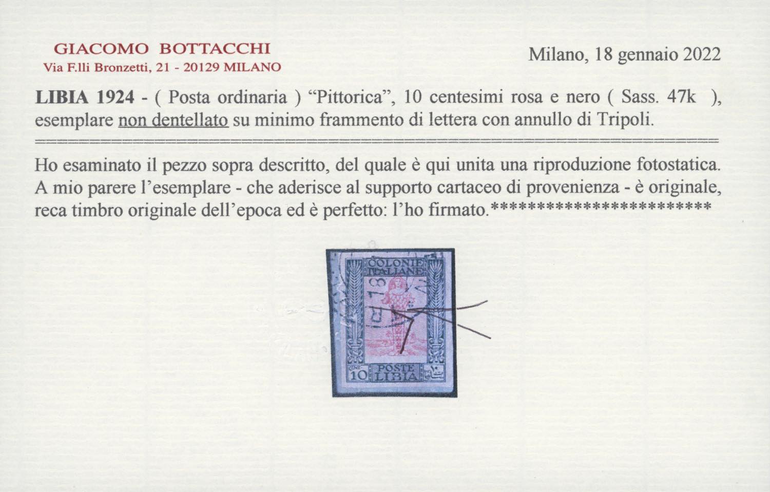 1924 - 10 cent. Pittorica, non dentellato (47k), usato su piccolo frammento a Tripoli. E.Diena, cert. Bottacchi.