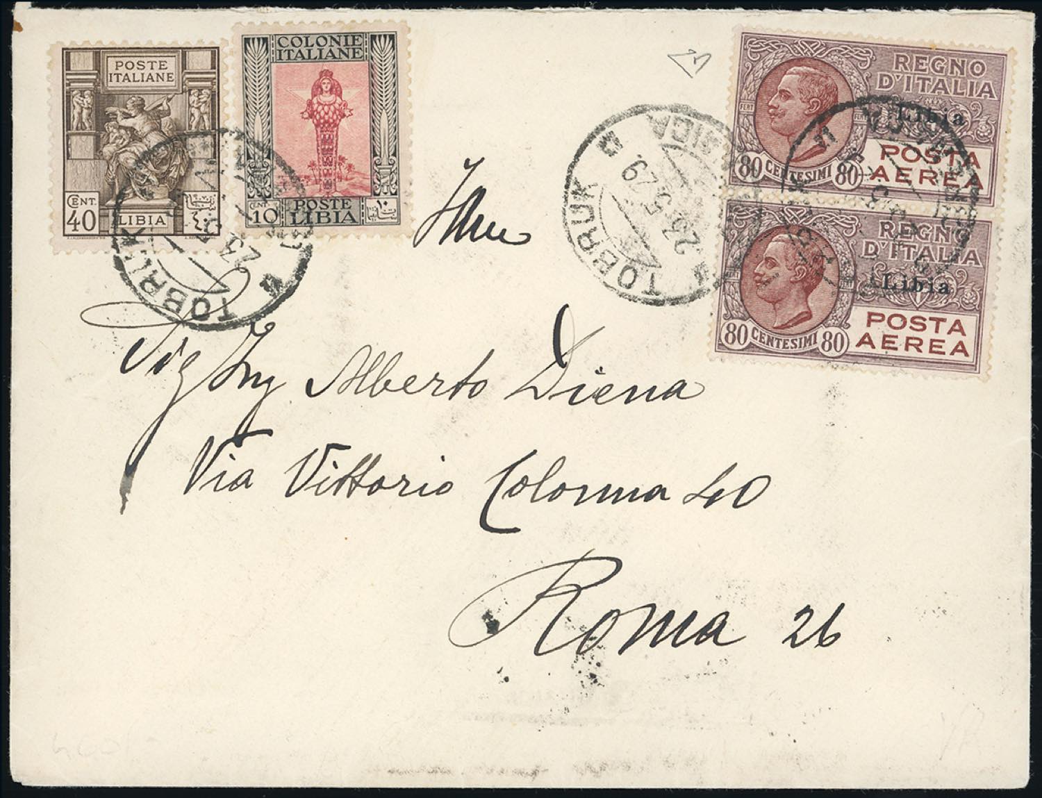 POSTA AEREA 1929 - 80 cent. soprastampato, coppia, 10 cent. Pittorica, 40 cent. Sibilla (A2,61,55), perfetti, su busta da Tobruk 23/5/1929 a Roma. E.Diena.