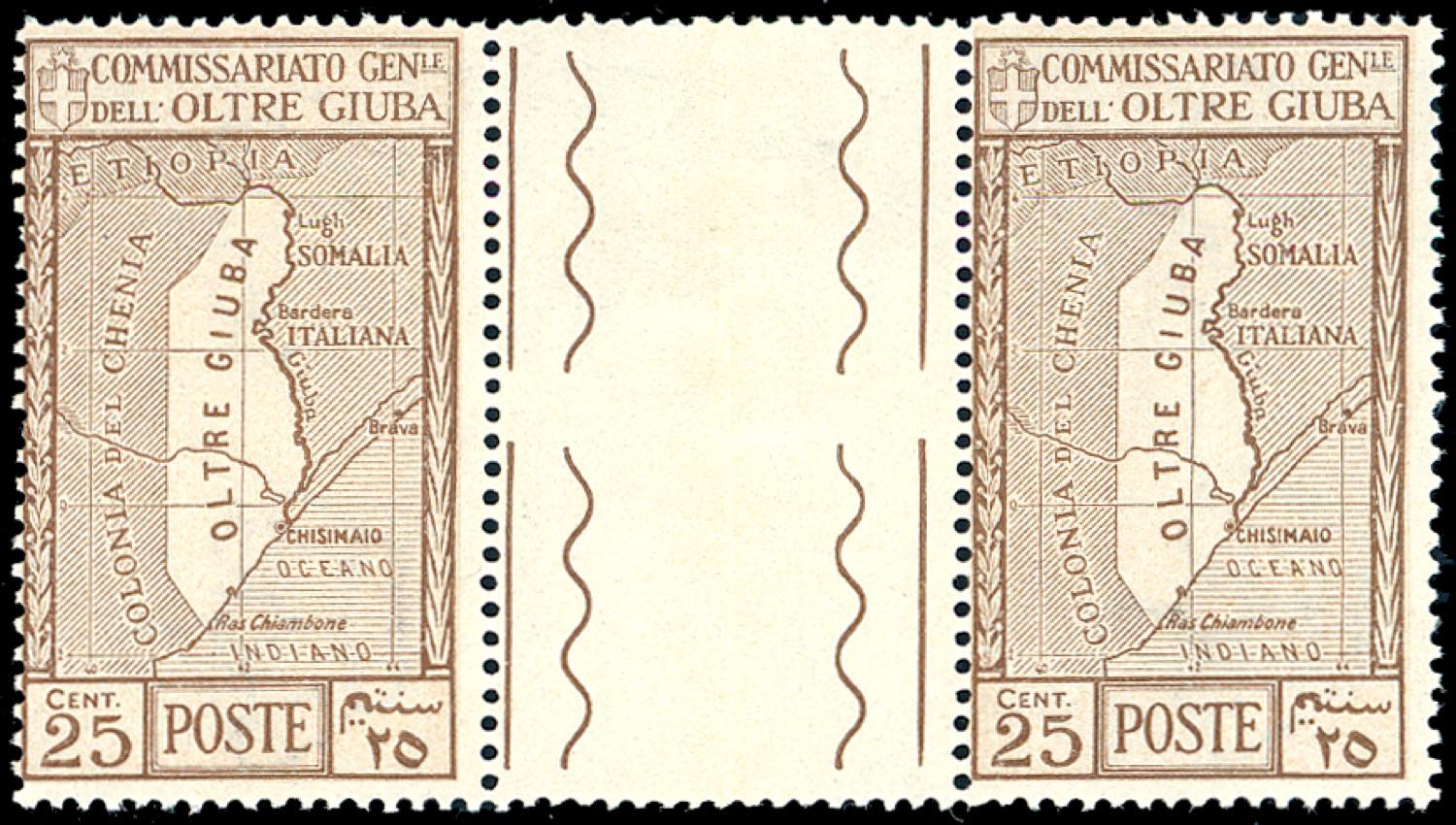 1926 - 25 cent. bruno Annessione (31), coppia orizzontale con interspazio di gruppo al centro, nuova, gomma originale integra, perfetta. Pochissime esistenti, rara e non catalogata. Ferrario.
