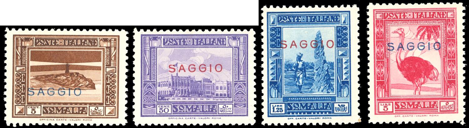 1932 - 5 cent., 50 cent., 1,25 lire, 5 lire Pittorica (167,175,177,181), soprastampati "saggio", perfetti e con gomma originale integra ad eccezione del 50 cent. che presenta una piega orizzontale ed è senza gomma.