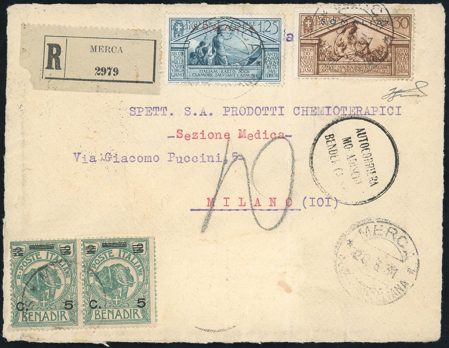 ANNULLAMENTI-AUTOCORRIERA MOGADISCIO BENDER CASSIM - 30 cent. e 1,25 lire Virigilio, 5 cent. su 2 a. Elefanti, coppia (152,155,74), perfetti, su frontespizio di busta raccomandata da Merca 20/3/1931 a Milano, bollo speciale circolare dell'Autocorriera sul fronte. Rara. Ferrario.
