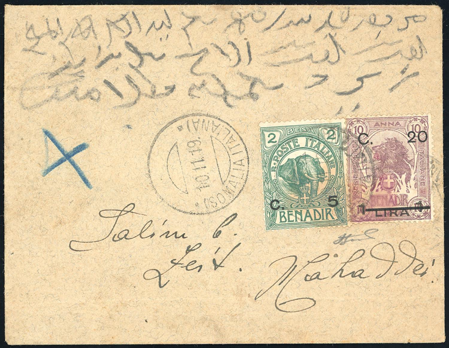 ANNULLAMENTI-BUGDA - 5 cent. su 2 a., 20 cent. su 1 lira su 10 a. Leoni ed Elefanti (11,18), ottimo stato, annullati con il guller scalpellato in alto, su busta del 10/11/1918 a Mahaddei Uen. Molto rara.