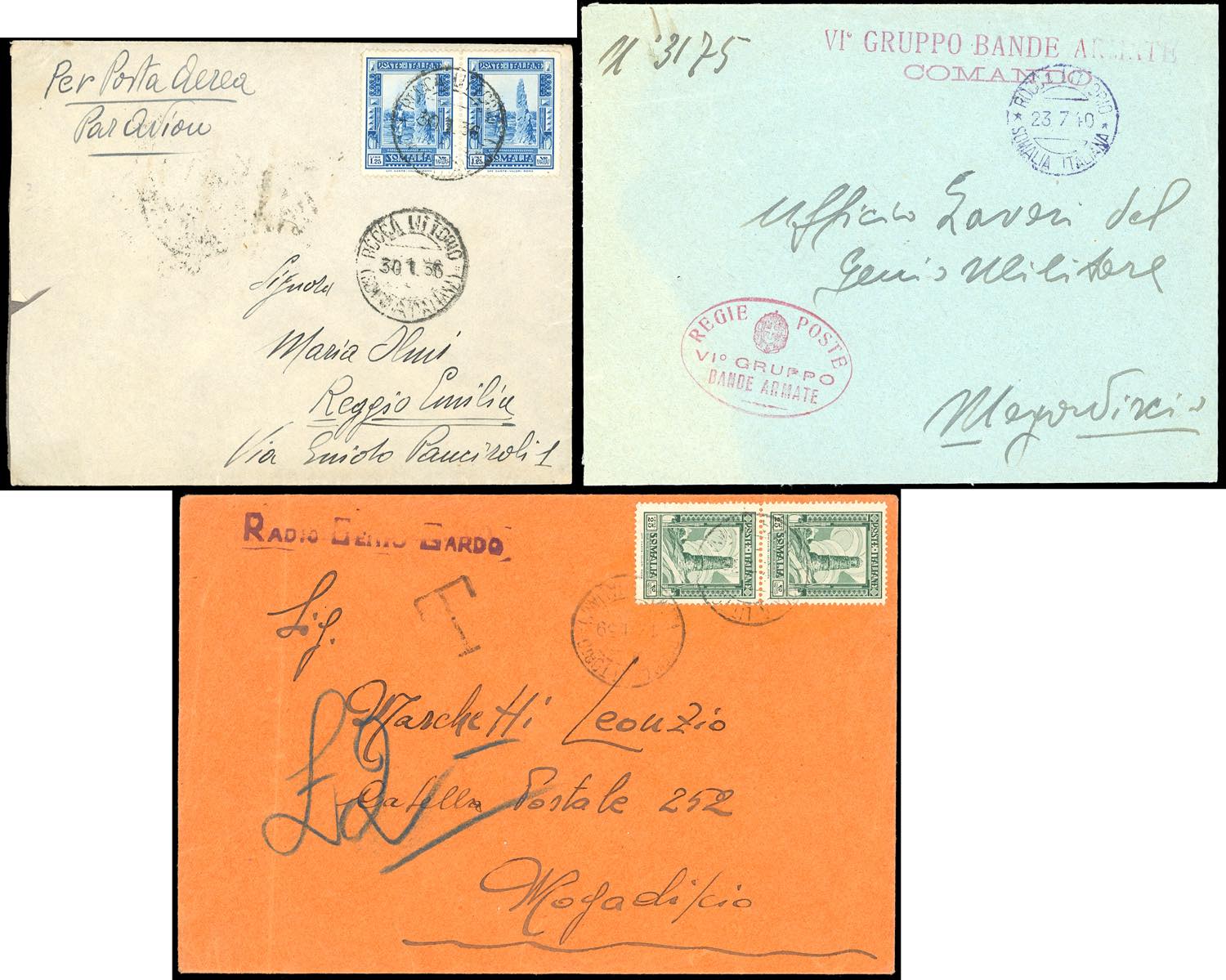 ANNULLAMENTI-ROCCA LITTORIO - 25 cent. Pittorica (218), coppia, perfetta, su busta del 14/1/1939 per Mogadiscio; 1,25 lire Pittorica (223), coppia, perfetta, su aerogramma del 20/1/1936 per Reggio Emilia; busta in franchigia del IV Gruppo Bande Armate 23/7/1940, bollo in viola, non catalogato, per Mogadiscio.