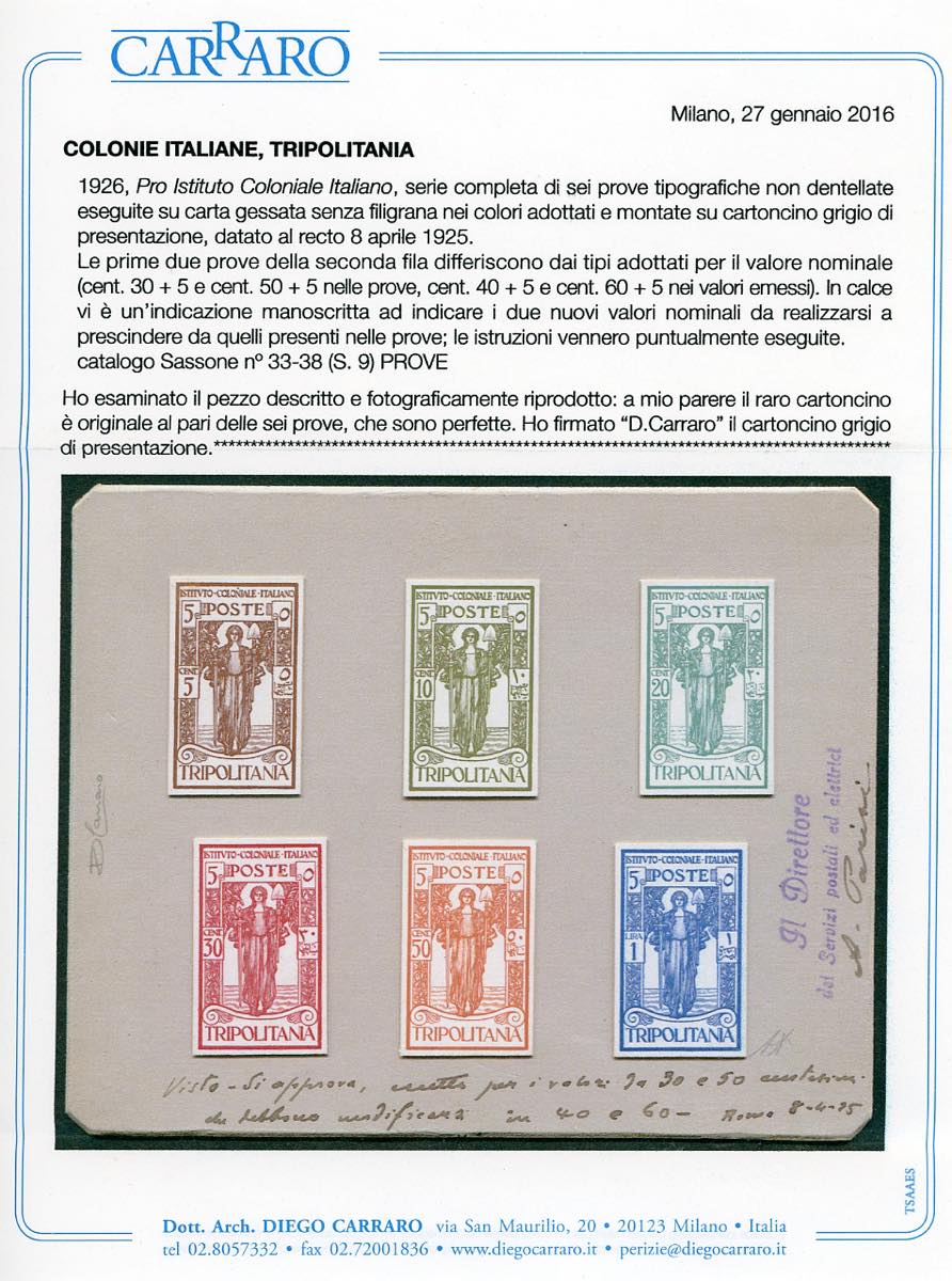 1926 - Istituto Coloniale, serie completa di sei prove tipografiche nei colori adottati, non dentellate, su carta gessata, perfette, montate su cartoncino datato 8/4/1925. Due prove differiscono dai francobolli adottati per il valore nominale, secondo le indicazioni manoscritte riportate sul cartoncino. Insieme probabilmente unico e di grande interesse. Cert. Carraro.