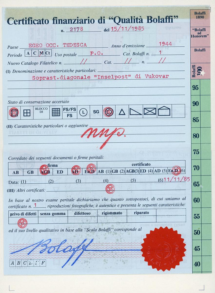 OCCUPAZIONE TEDESCA EGEO 1944 - Inselpost bruno rosso, emissione di Vukovar (1), perfetto, usato su frammento a Rodi 25/12/1944. Raro. Cert. E.Diena, Oro Raybaudi e Finanziario Bolaffi 100%.
