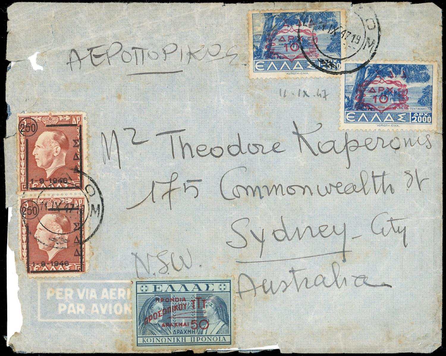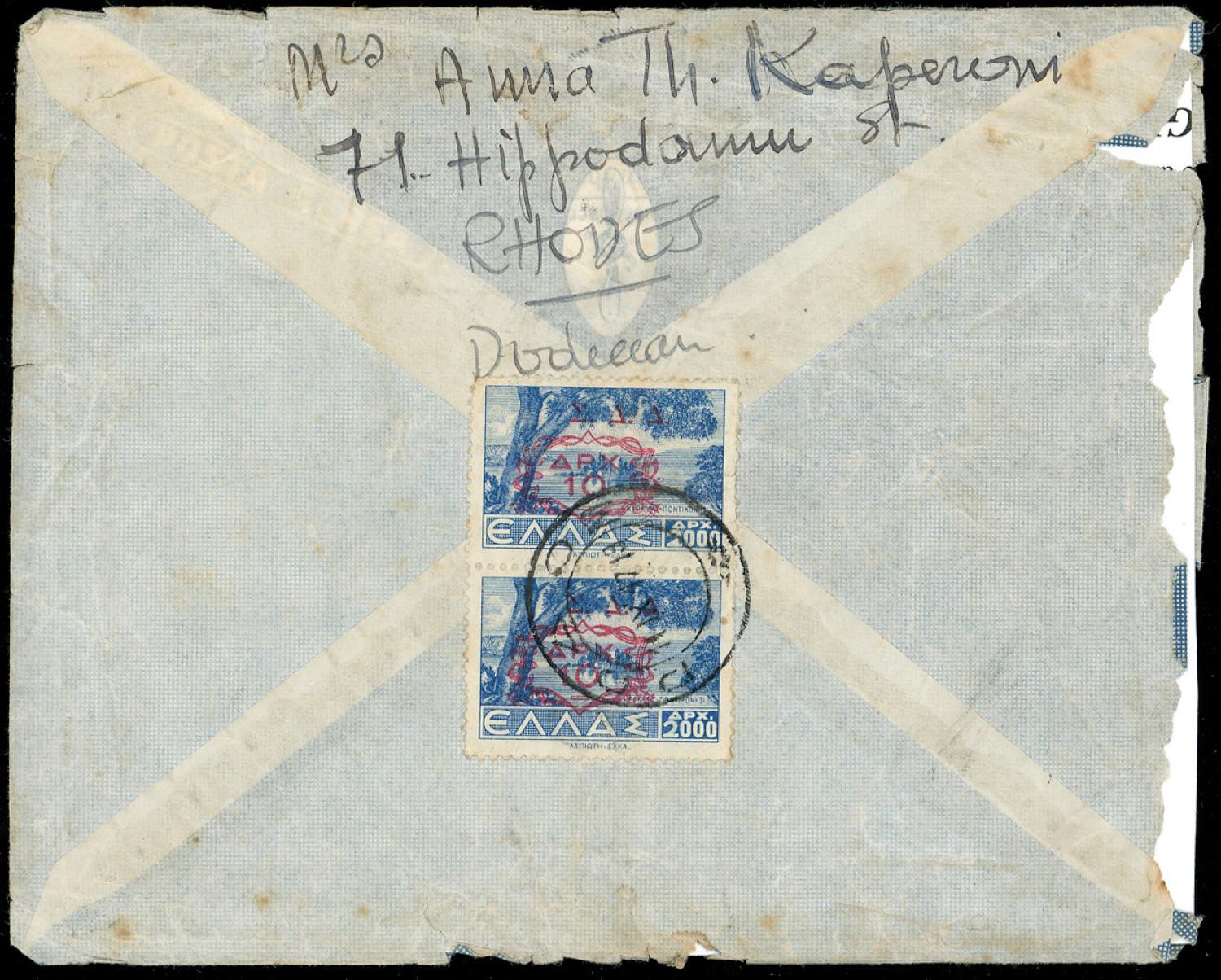 AMMINISTRAZIONE MILITARE GRECA DODECANESO 1947 - 10 d. su 2000 d. due esemplari sul fronte e due al verso, 250 d. su 3 d., due esemplari (1,10), difetti, su aerogramma da Rodi 11/9/1947 per Sidney, Australia. Destinazione molto rara.