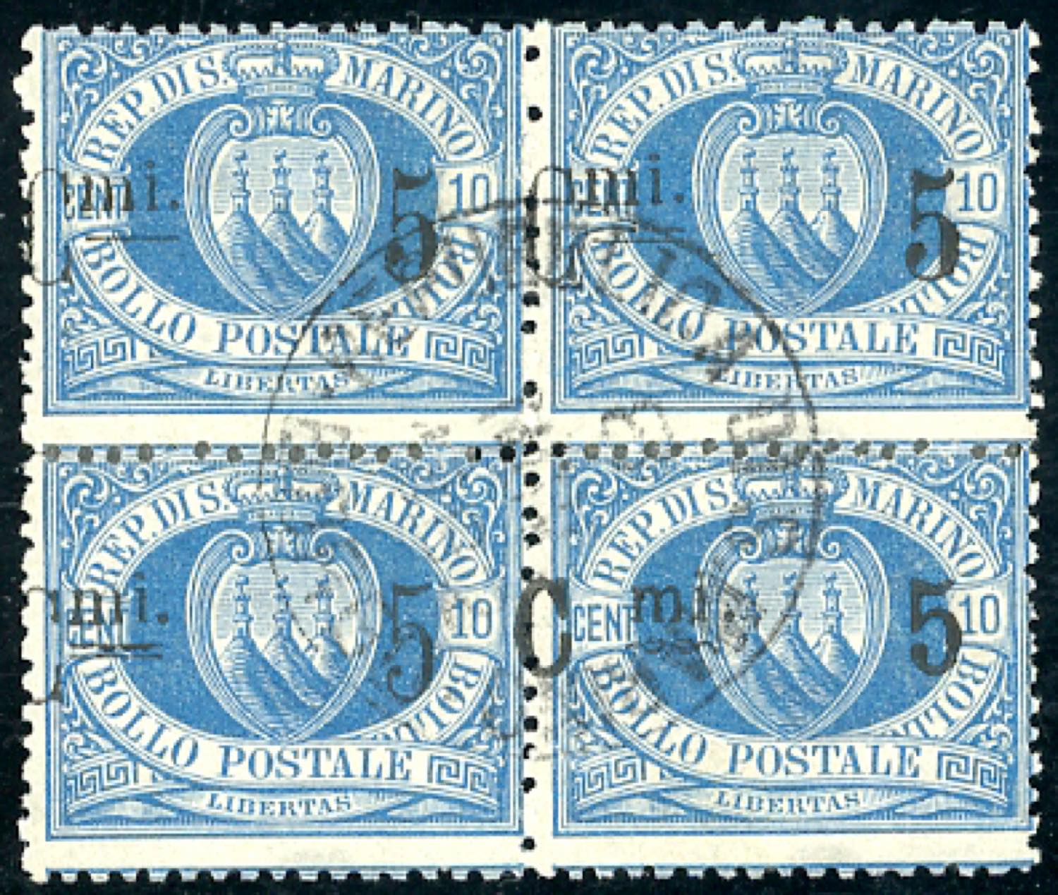 1892 - 5 cent. su 10 cent. (8), blocco di quattro con varietà nei caratteri della soprastampa, usato, perfetto. Raybaudi.