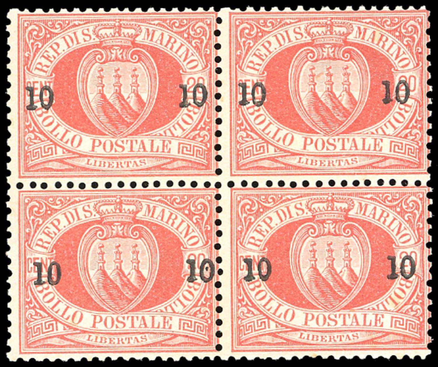 1892 - 10 cent. su 20 cent. (11), blocco di quattro, gomma originale integra, perfetto. Eccezionale freschezza. A.Diena, cert. Raubaudi.