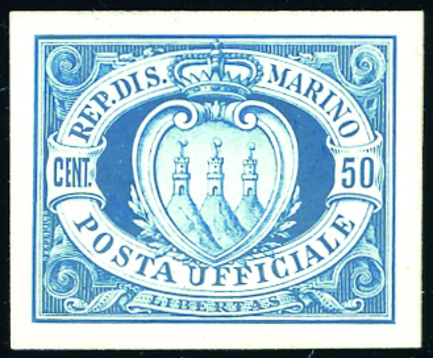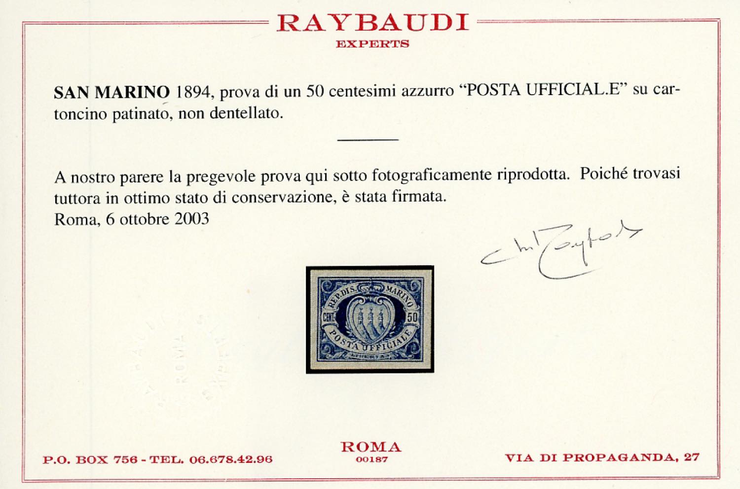 1894 - 50 cent. azzurro Stemma, dicitura "Posta Ufficiale", prova su cartoncino patinato, non dentellata, nuova senza gomma. Rarissima! Cert. Raybaudi.