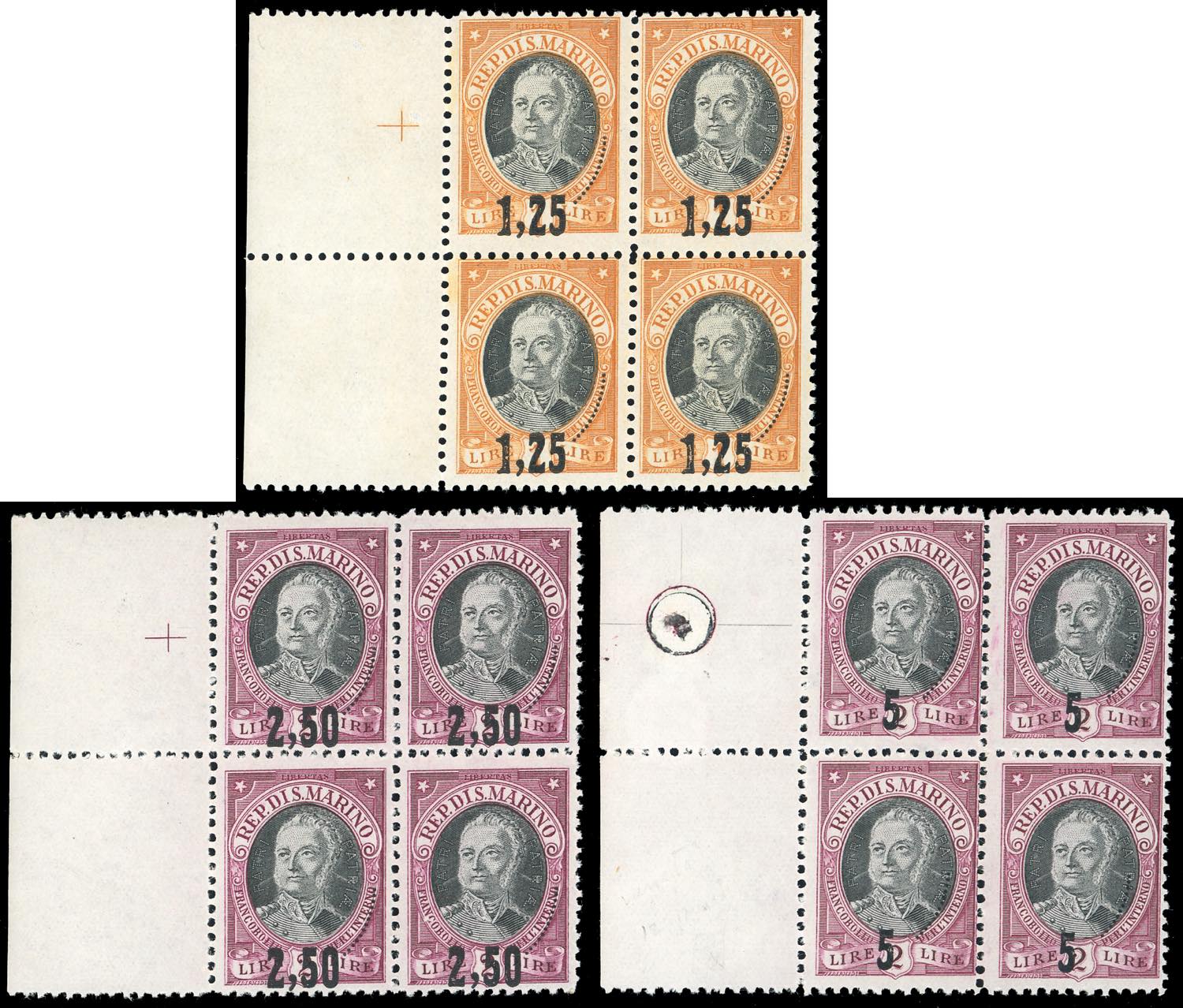 1927 - Onofri soprastampati, serie completa (130/132), blocchi di quattro, bordo di foglio, gomma originale integra, perfetti. Belli.
