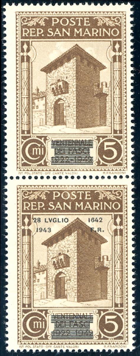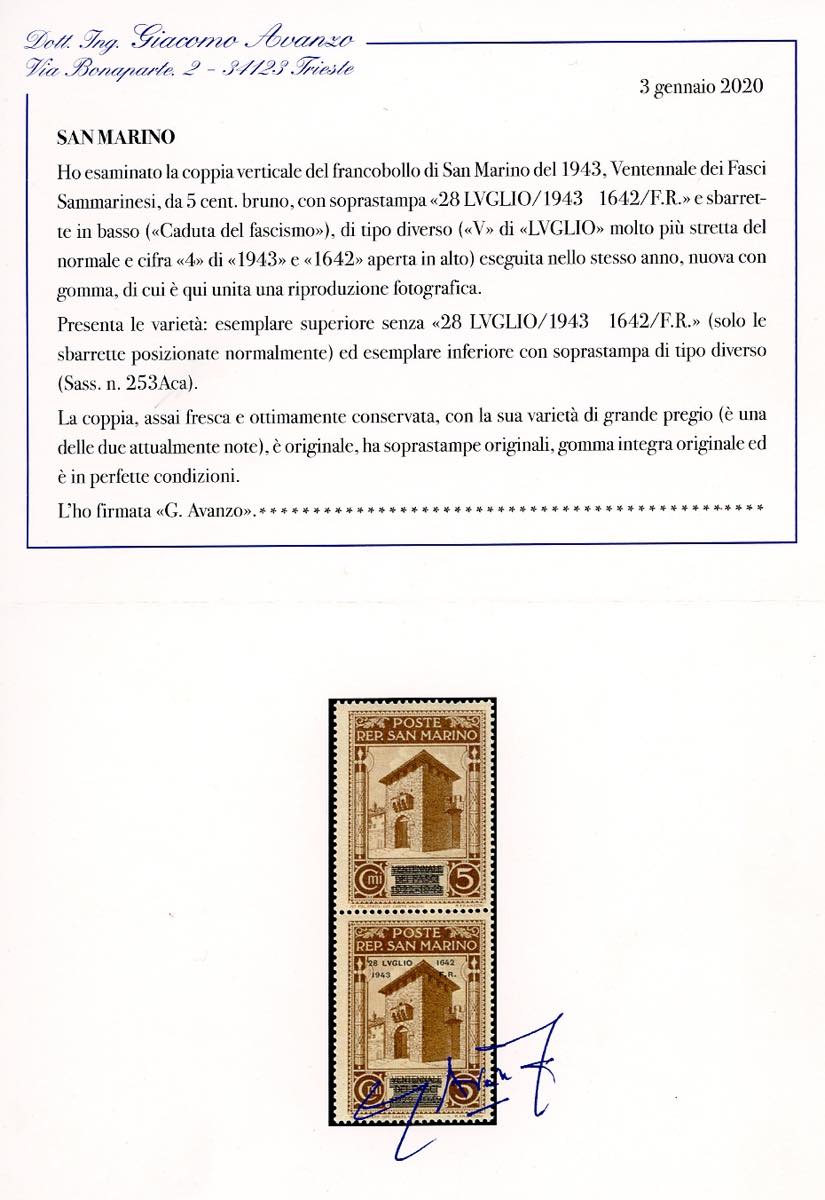 1943 - 5 cent. Caduta del Fascismo, soprastampa di tipo diverso, coppia verticale, il primo esemplare senza la data (253Aca), gomma ... Leggi tutto