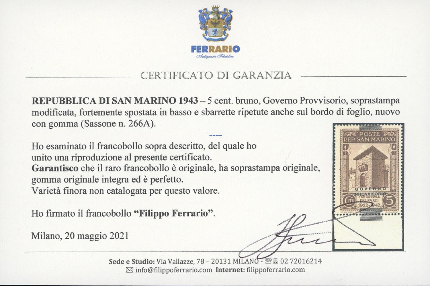 1943 - 5 cent. Governo Provvisorio, soprastampa modificata di tipo diverso, fortemente spostata in basso e sbarrette ripetute anche sul bordo di foglio (266A), gomma integra, perfetto. Bella e rara varietà, non catalogata per questo valore. Cert. Ferrario.