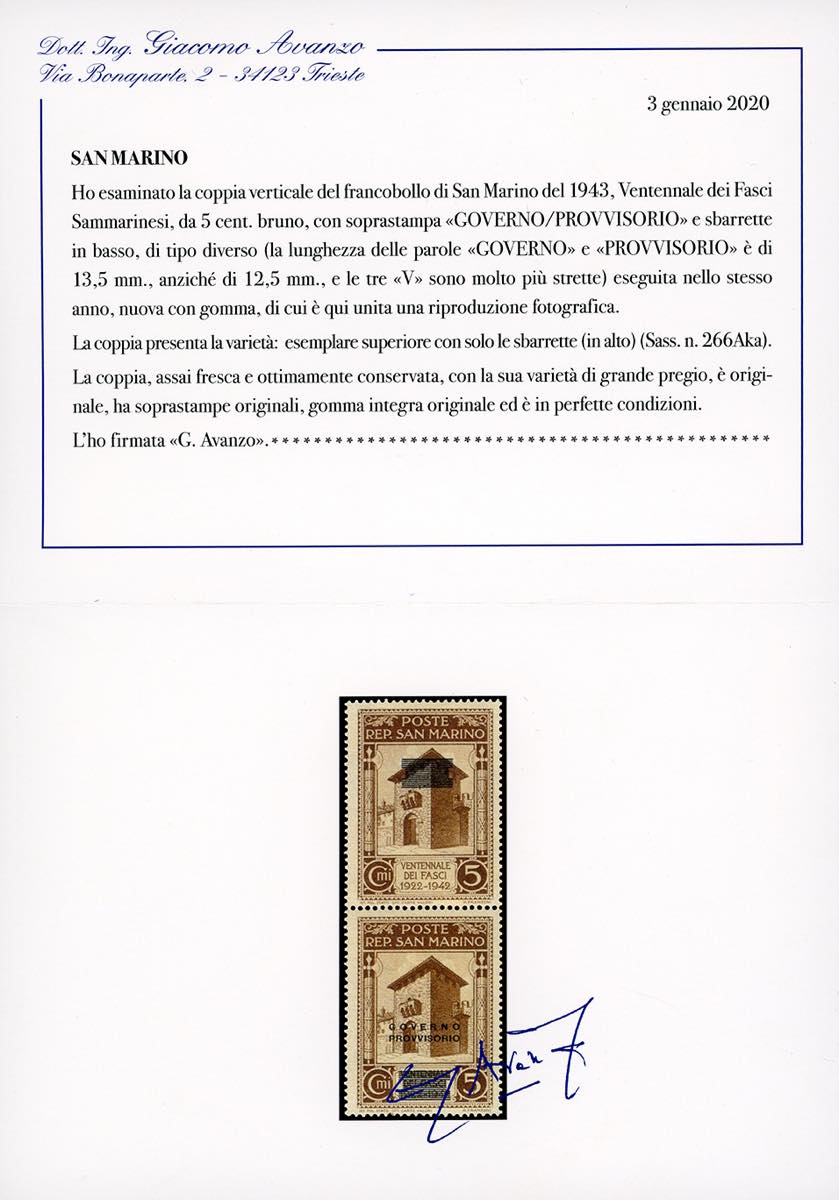 1943 - 5 cent. Governo Provvisorio, soprastampa di tipo diverso, coppia verticale con l'esemplare superiore con solo le sbarrette in alto (266AKa), gomma originale integra, perfetta. Molto rara. Cert. Avanzo.