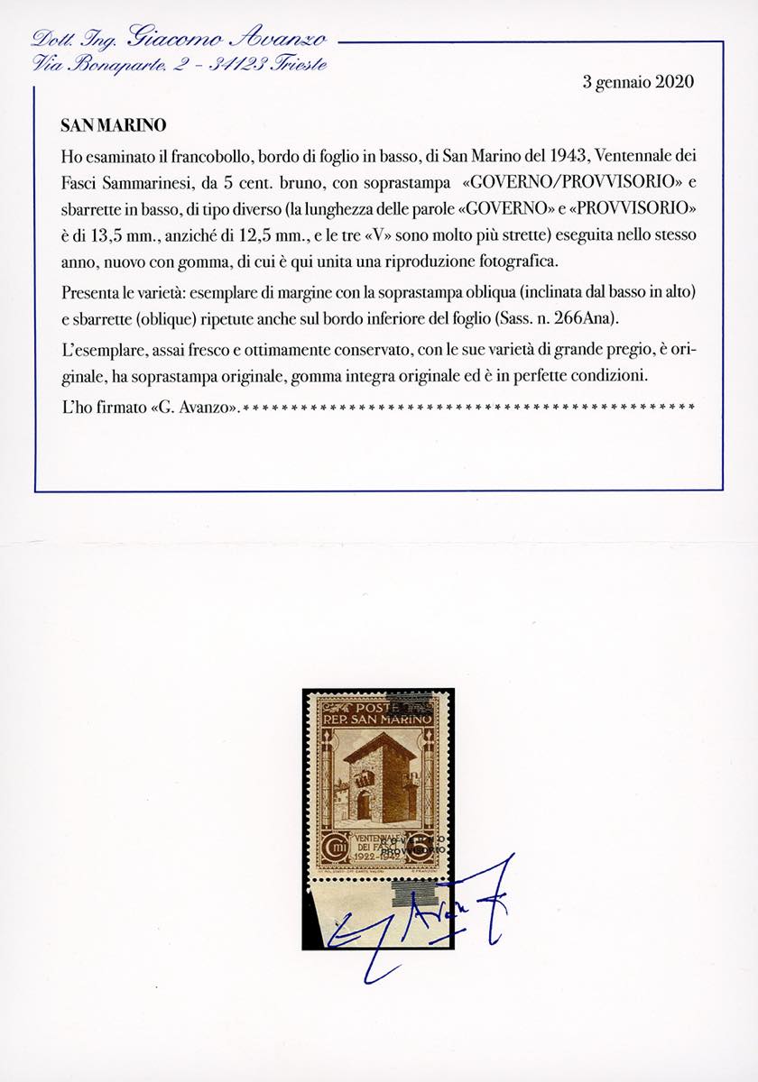 1943 - 5 cent. Governo Provvisorio, soprastampa di tipo diverso, esemplare bordo di foglio con la soprastampa obliqua e le sbarrette ripetute anche sul bordo di foglio (266Ana), gomma originale integra, perfetto. Raro. Cert. Avanzo.