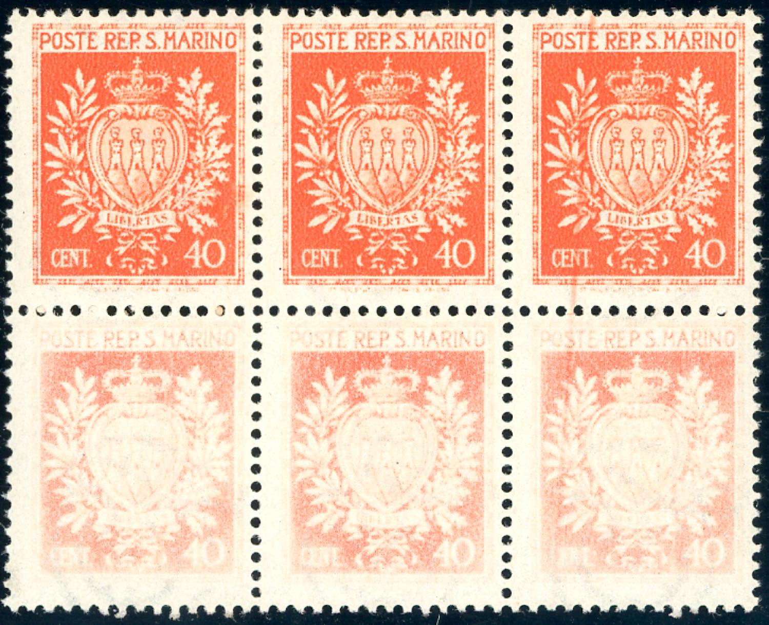 1945 - 40 cent. Stemmi, blocco di sei, i tre esemplari inferiori con stampa evanescente (281h), gomma originale integra, perfetto. Ferrario.